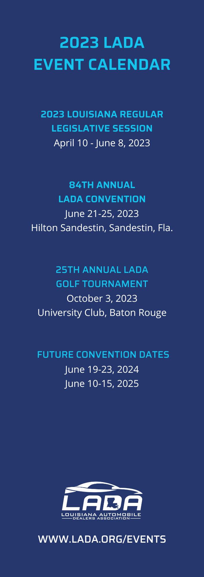 We are all looking forward to seeing everyone at the Hilton Sandestin for the 84th Annual LADA Convention June 21-25! We have more information featured in this issue on pages 12 & 13. Until then, please be rest assured that our staff will continue to work tirelessly for you at the Captiol during this Legislative Session. Do not hesitate to contact the LADA staff should you have any questions or concerns.