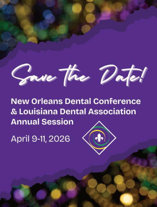 JOURNAL of the Louisiana Dental Association (USPS284620) is published quarterly at 818 Pierremont Rd., Shreveport, LA 71106, in March, June, September and December, and is the official publication of the Louisiana Dental Association. Opinions and statements expressed, however, are those of the writer and not necessarily those of the Association. Original articles published herein become the property of this publication. Subscription price is $18 per year for members, $30 per year for non-members and $65 per year for foreign subscribers. Periodicals postage paid at Baton Rouge, Louisiana, and additional mailing offices.