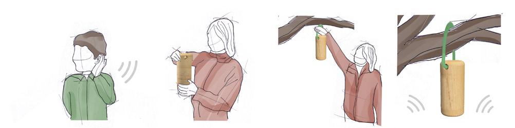 Using product to listen to their surroundings. Helen puts together the device. The device is hung on the chosen spot. The device is powering on.