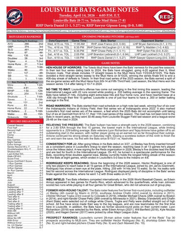 RODRIGUEZ KEEPS REACHING: Since the beginning of the 2026 season, Hector Rodriguez is one of only two players to reach base in all 15 games of the International League, joined by Jim Jarvis (Gwinnett). Rodriguez has shown a keen eye at the plate, hitting .259 with 14 hits and 15 walks. So far, his walks rank tied for second across the International League. Rodriguez displayed plenty of discipline in the Bats' series finale against the Indians, where he went 1-2 with three walks on 4/12.