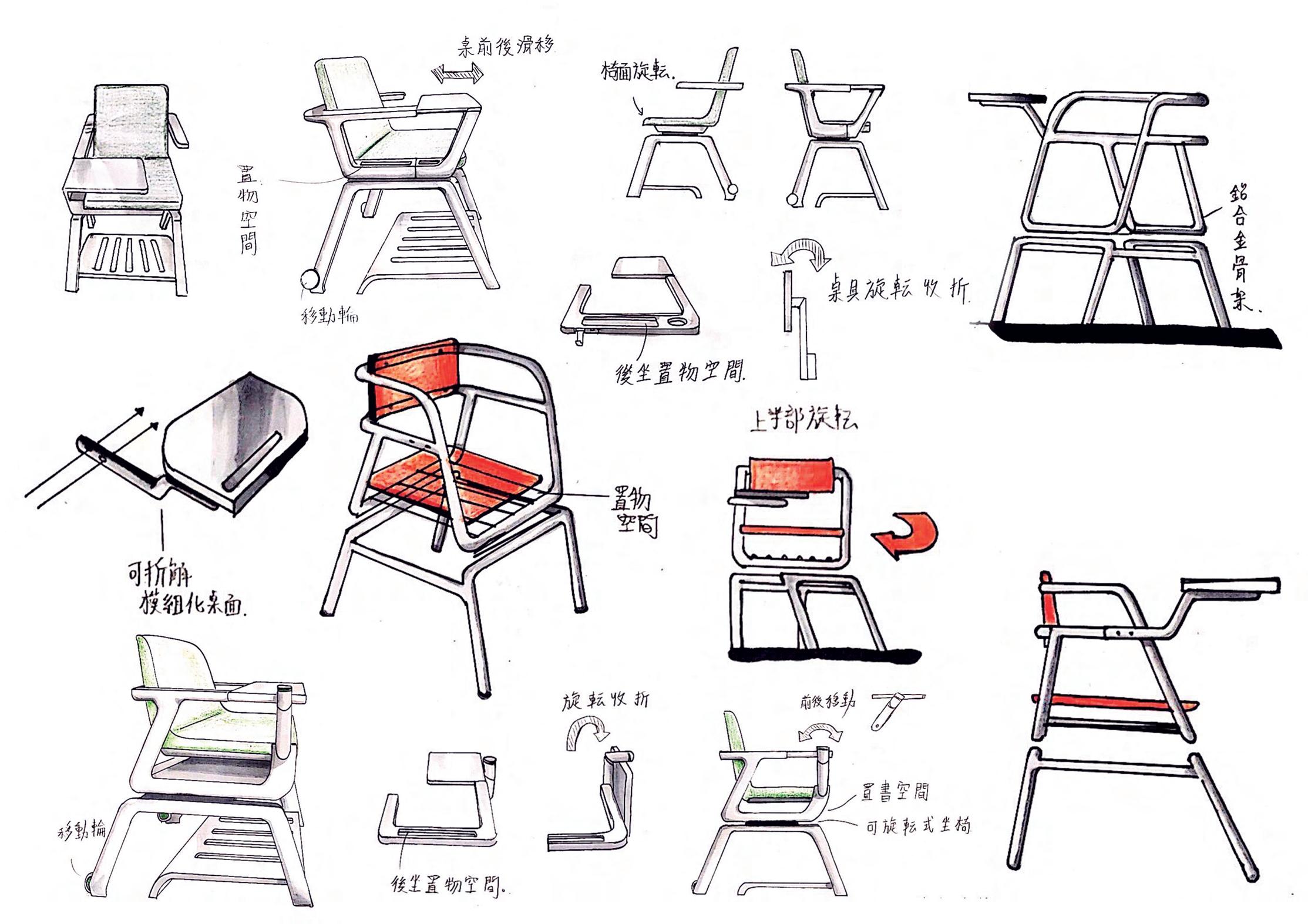 眾所皆知大學的課程相當多元,除了傳統聽講課程外,不同課程上課方式也有 所不同。有的注重於討論會話、實作或動態活動......等。而大學上課教室及課程 不固定,教室課桌椅能夠盡可能滿足不同需求是相當重要的。 而近年來高中因應新課綱而上路的的多元選修課程,使得高中校園如同小型大 學一般,使學生自由體驗與探索不同多元課程。而針對這些課程不同教學方式 所需的課桌椅,對於學生及老師好的學習體驗也是不可或缺的。 藉由調查與分析高中大學多元選 修課程的種類與對於課桌椅的需 求而得出ROJOY需具備的功能開 始發想。希望打造出能夠滿足不 同課堂需求的鋁製課桌椅。 設計背景 BACKGROUND 多 元 課 程 課程種類 課桌椅需求 功能需求 傳統上對下講述 語言會話與分組討論 需大實作空間(如:舞蹈...) 桌面實用性 保持桌椅整齊 方便相互互動 使用實用性 方便移動與歸位 動態課程 互動討論課程 靜態課程 多角度桌面 非滑動椅腳 可旋轉 置物空間 輕量鋁骨架 ROJOY