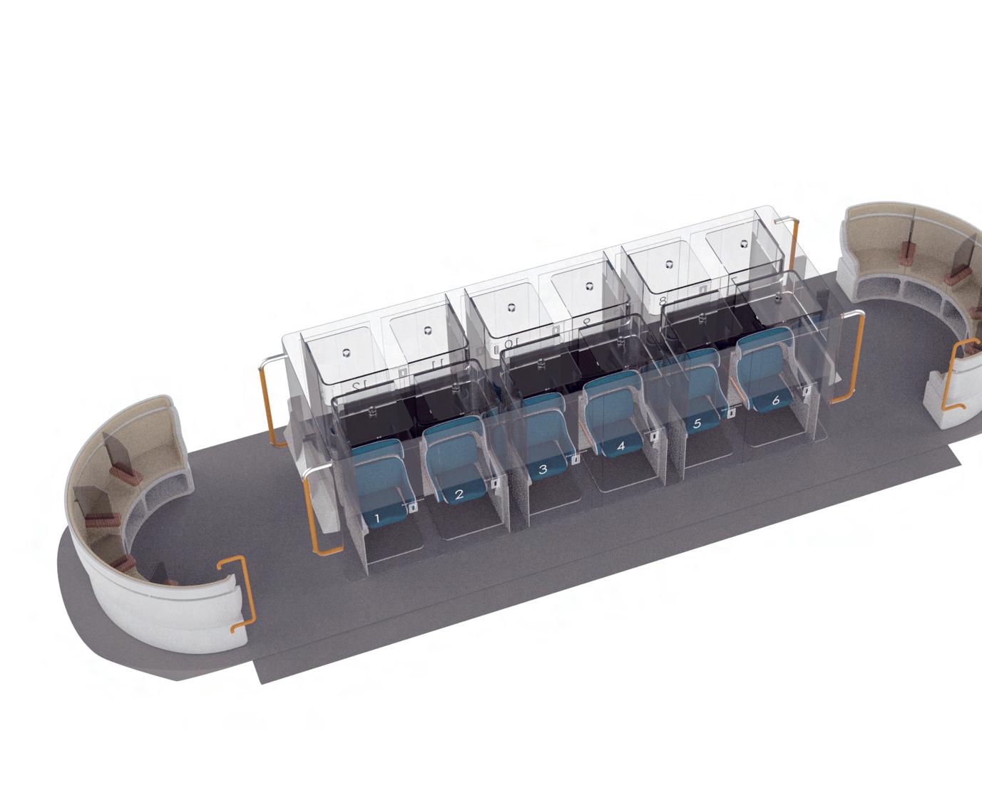 公共空間與站立區 個人空間區 Personal Area Public Area 提供個人或群體在與外界隔離下的互動空 間,並設有個人娛樂系統。 提供短時間搭乘之乘客的空間,各座椅設 有隱蔽隔板,站立區則設有倚靠墊。 ULTUS 「Ultus是一台著重疫情安全、 舒適與通用設計的中長途公車」