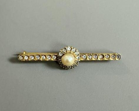 travail du xixème siècle - Broche-barrette en or jaune 18k (750 millièmes) ornée sur la partie centrale d’une perle bouton et de diamants brillantés taille ancienne, ainsi que de deux lignes de petits diamants taille ancienne longueur : 5 ,3 cm Poids brut : 4 g