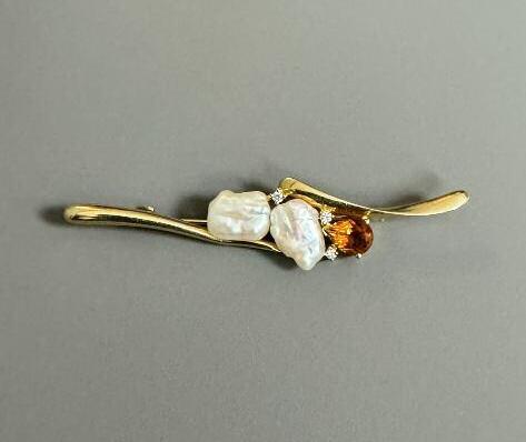 6 BROCHE en or jaune 18k (750 millièmes) ornée sur la partie centrale de deux perles baroques, petits diamants et un grenat.