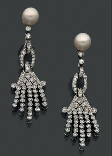 en or blanc 18K (750°/00) ornées de perles de culture, à décor de pampilles serties de diamants taille 8/8