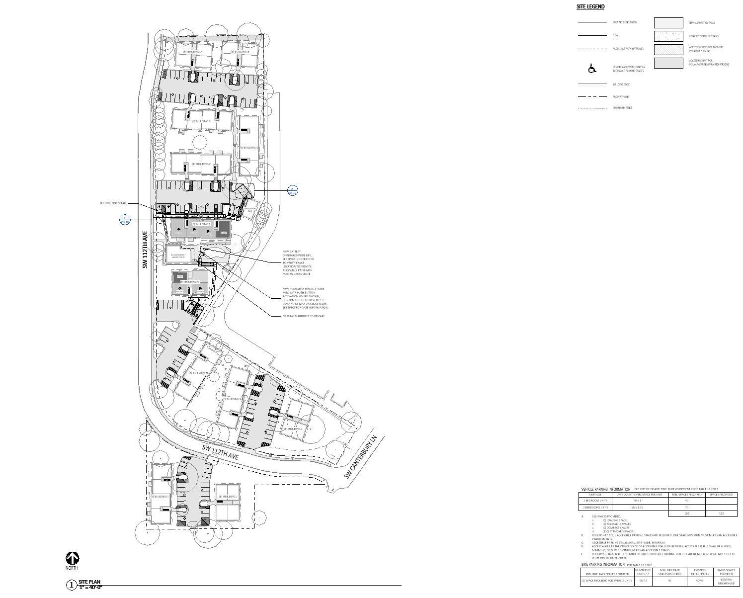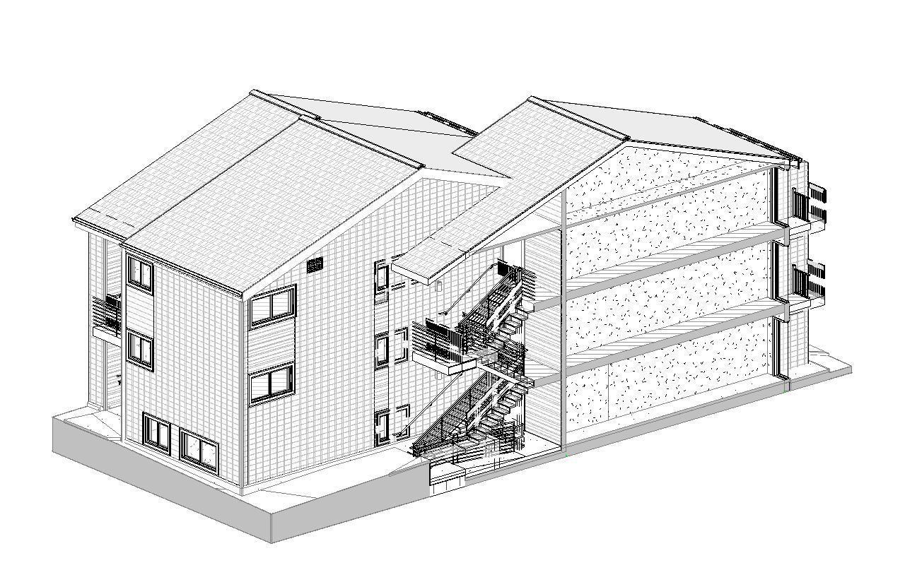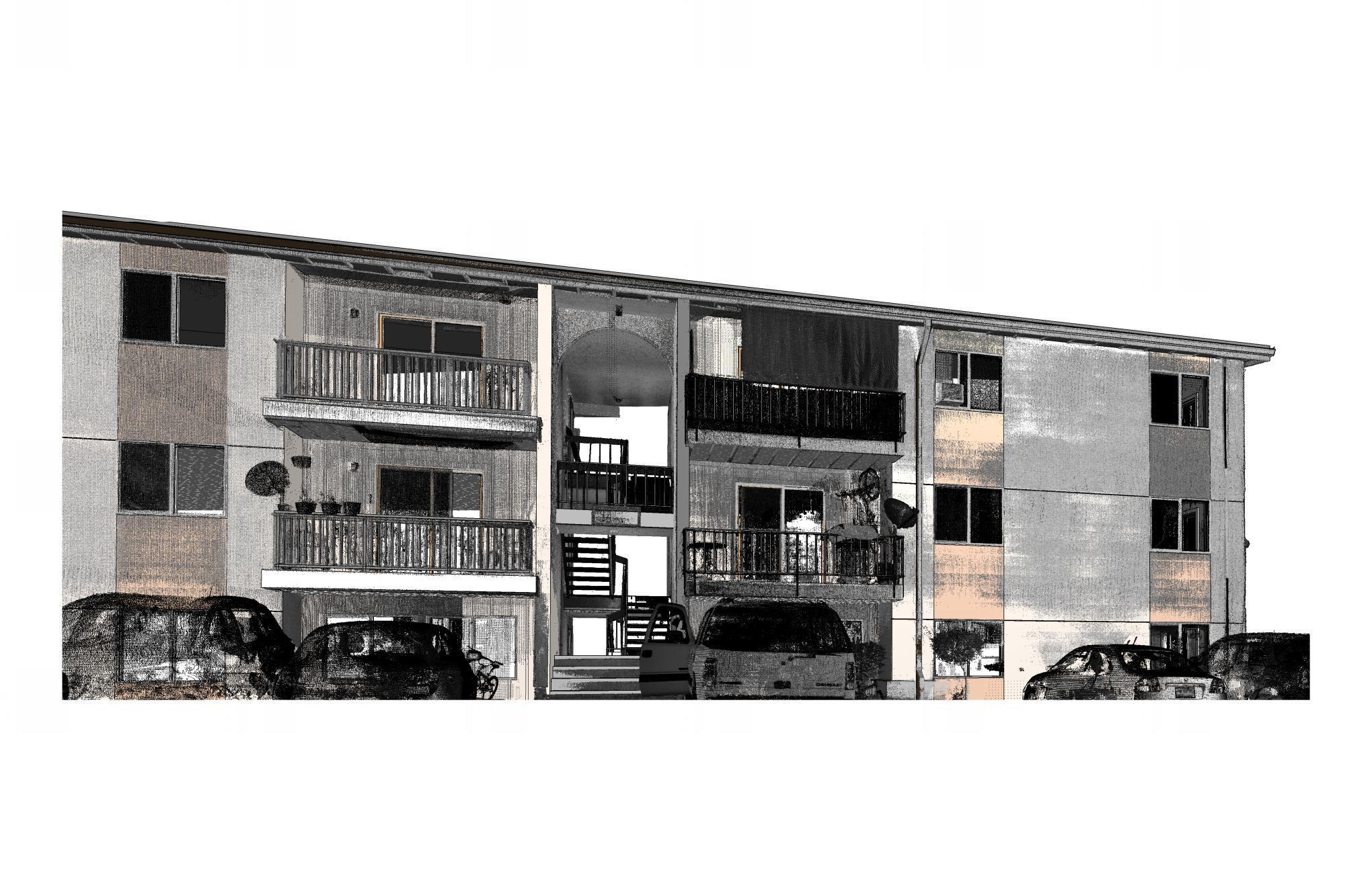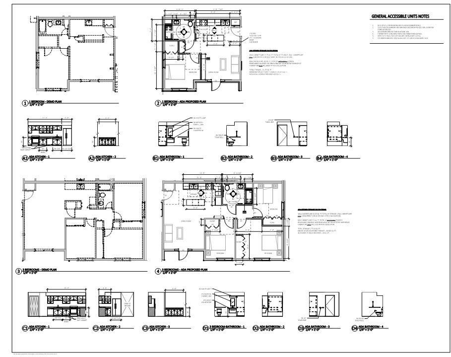 Renovation of twelve existing, two stories, wood framed affordable housing apartments including conversion of accessible units. Exterior cladding, windows and unit entry doors replacement. All new compliant stairs, stair railings, and landing railings. Upgraded waterproofing and ventilation. New accessible path to right of way, new accessible trash enclosure, grind and overlay existing parking lot with minor alternations for efficient layout, pool fence renovation and ada lift. Three new laundry closets under existing roof.