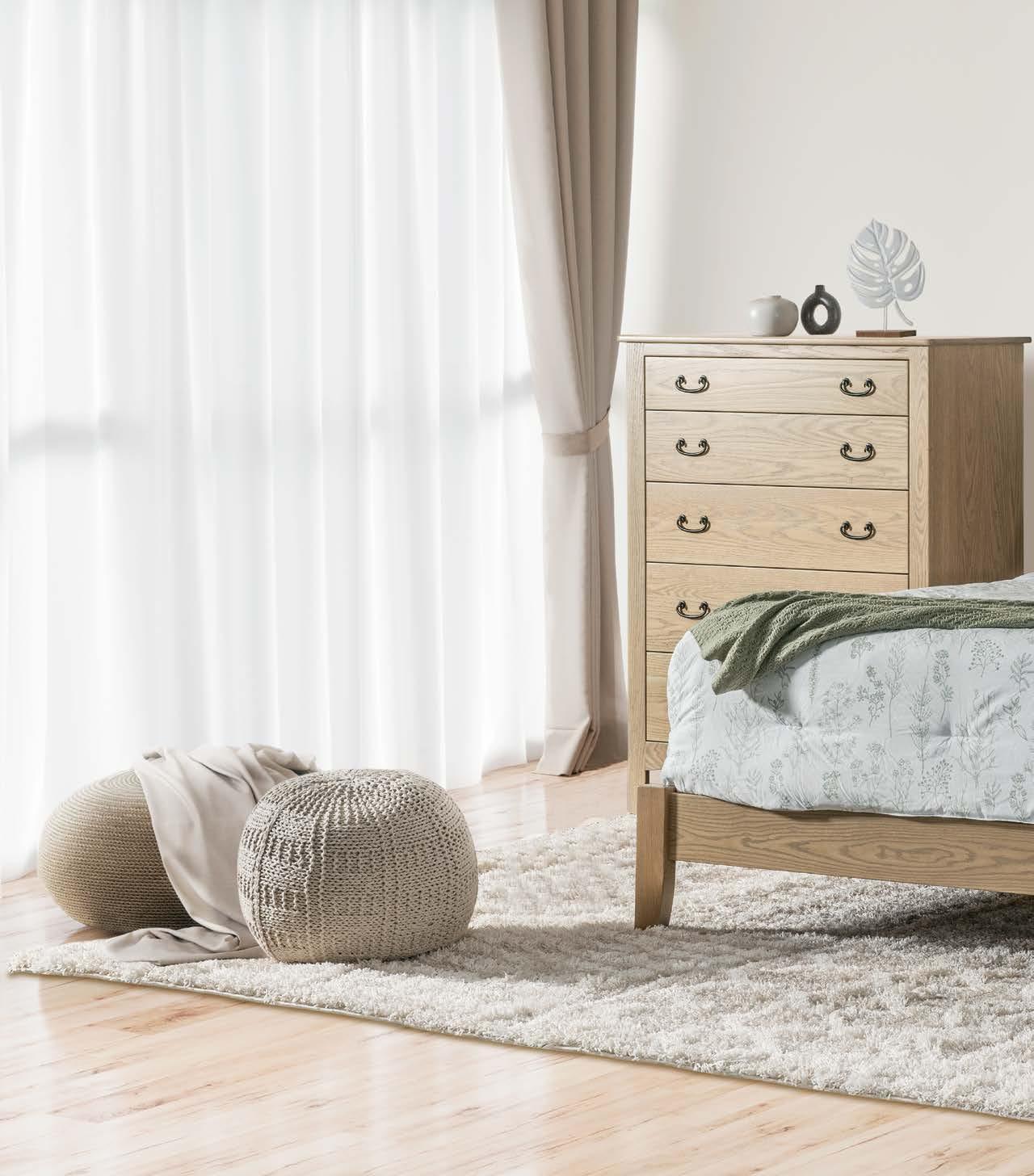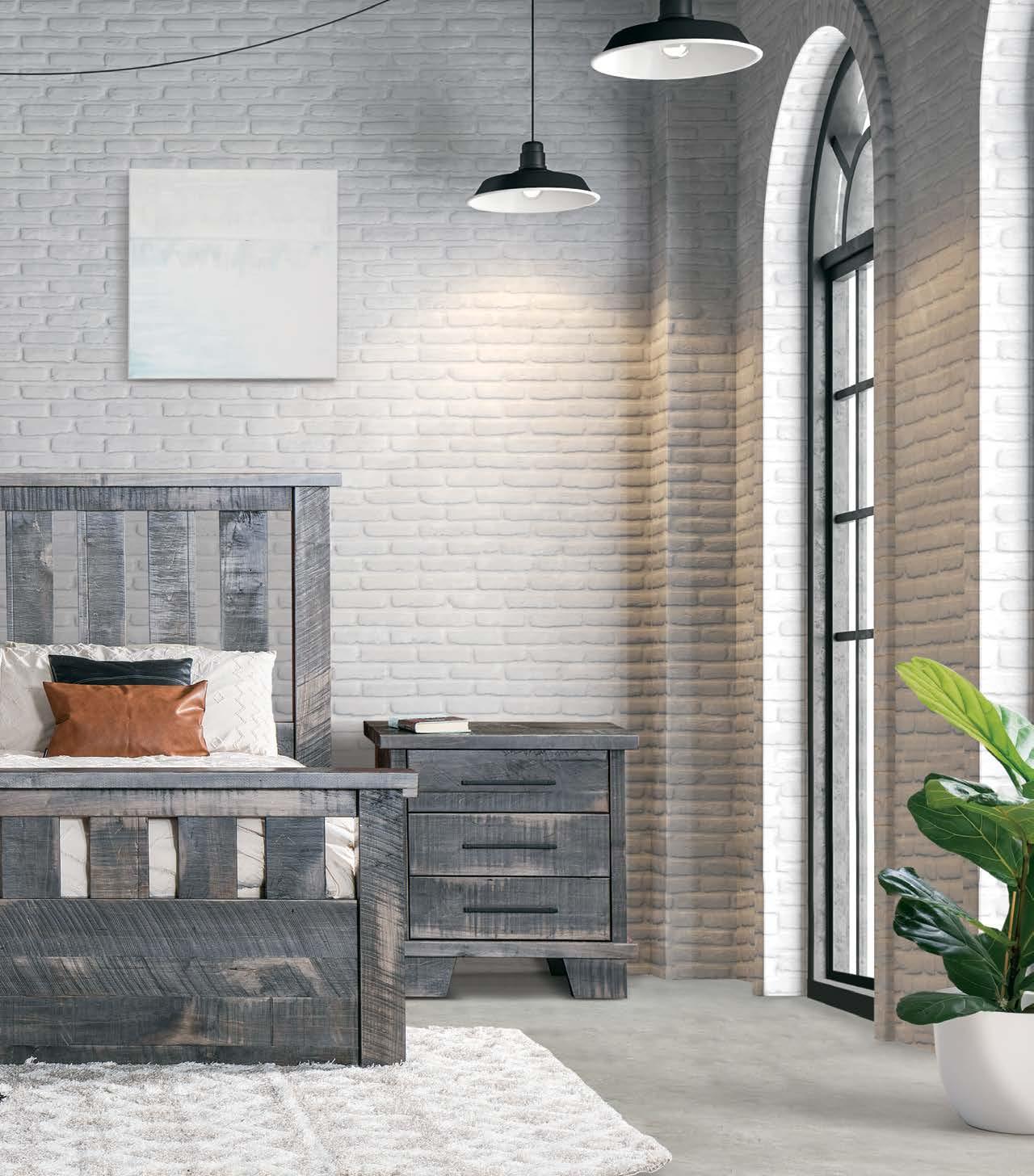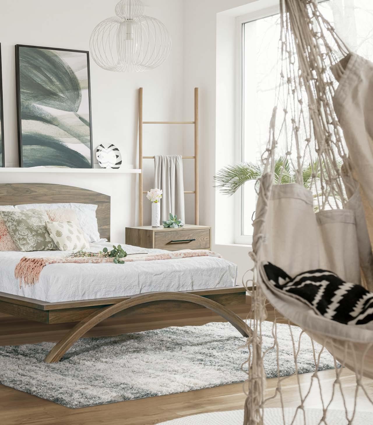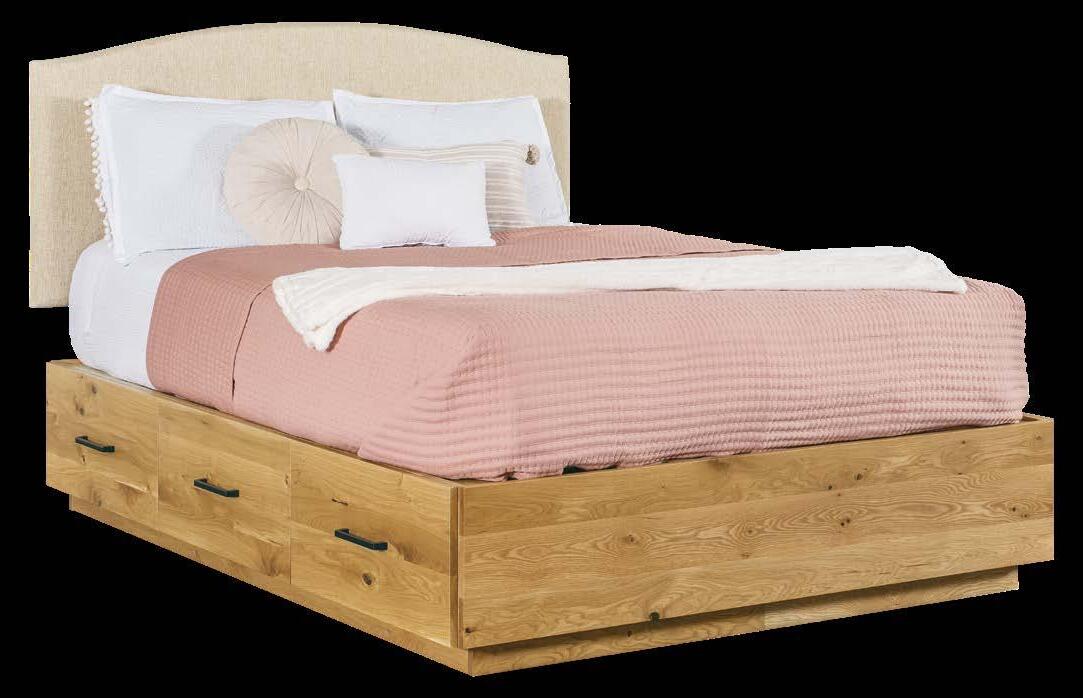 Arcadia Collection shown in Rustic White Oak with Granola 5 sheen. Headboard R1-31 fabric. Upholstered headboard is optional.