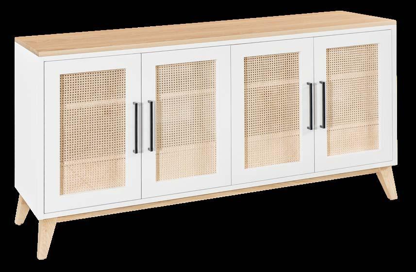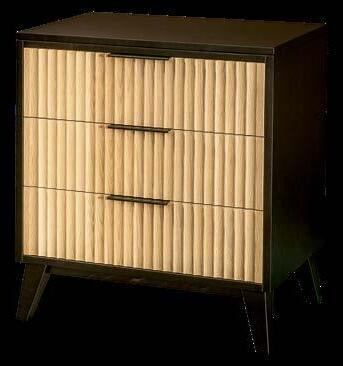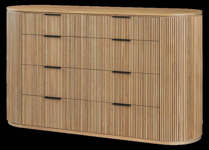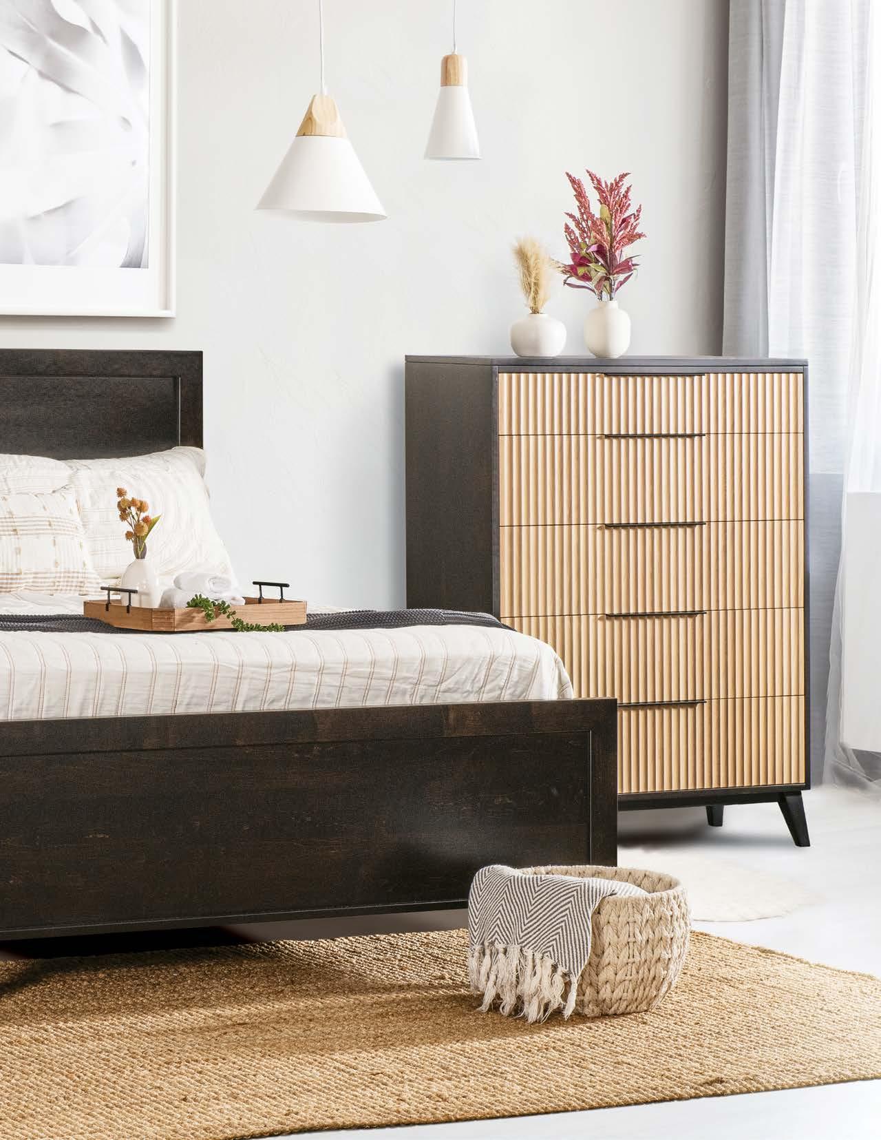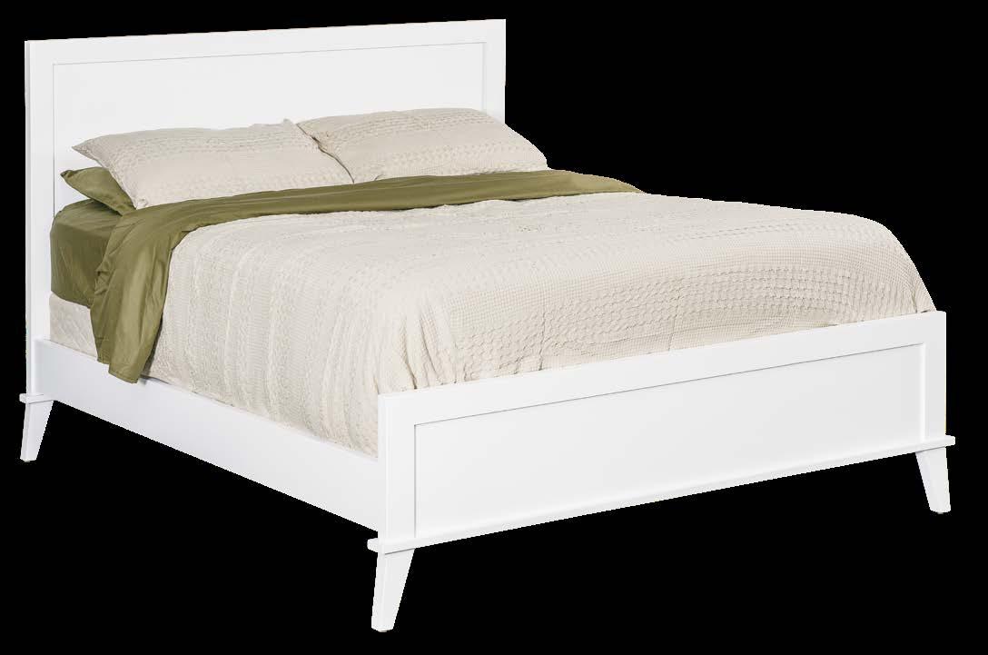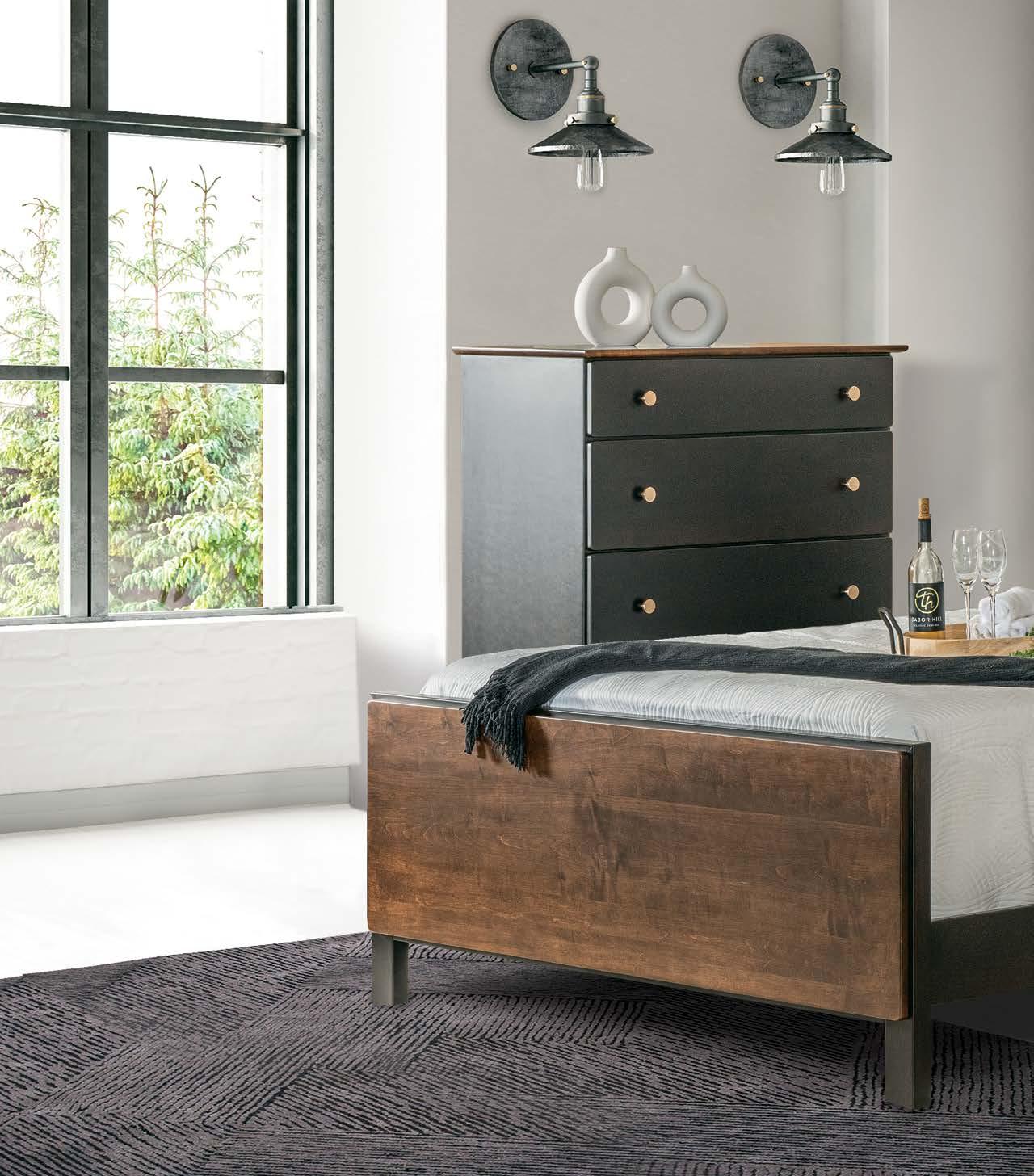 Arcadia Collection shown in Rustic White Oak with Granola 5 sheen. Headboard R1-31 fabric. Upholstered headboard is optional.