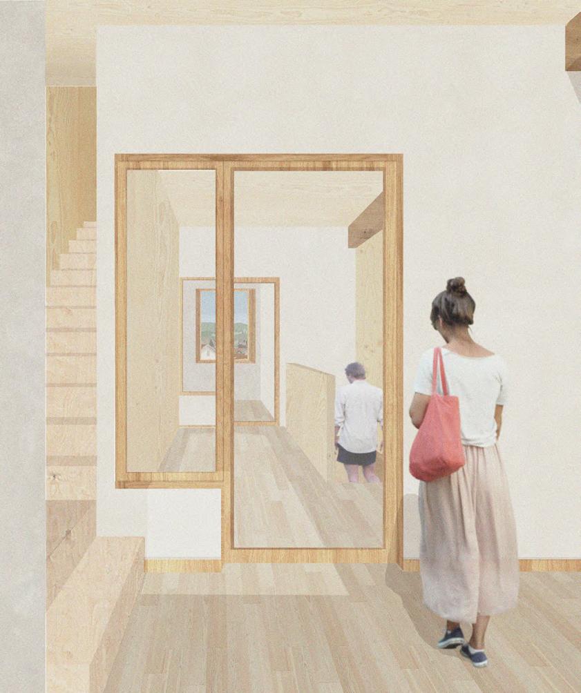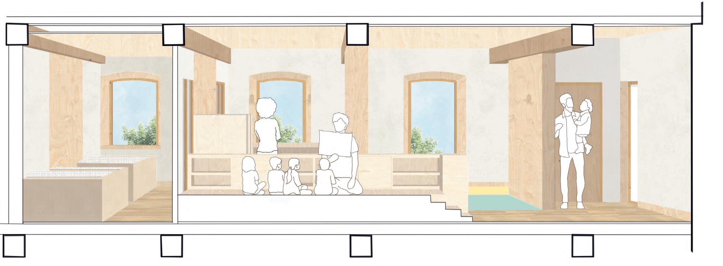 Le bâtiment de la Farandole se positionne comme une masse entre le bourg, au nord, et le panorama paysager, au sud. Fermée et dessinant une place arrière avec le dos de l’église, la façade nord ne convie pas les différentes entités à se rencontrer. Le projet propose un nouveau dessin des sols, afin de penser la place, l’ancien couvent et son grand jardin comme un ensemble, reliant bourg et paysage. De nouveaux programmes habitent le lieu afin de lui offrir une nouvelle dynamique. Une bibliothèque, une crèche et une garderie mutualisée à la cantine existante invitent différents usagers, sur des temporalités plus longues et variées, dynamisant ainsi le bourg. Une partie de l’édifice propose également des logements en duplex pour des familles de réfugiés climatiques.