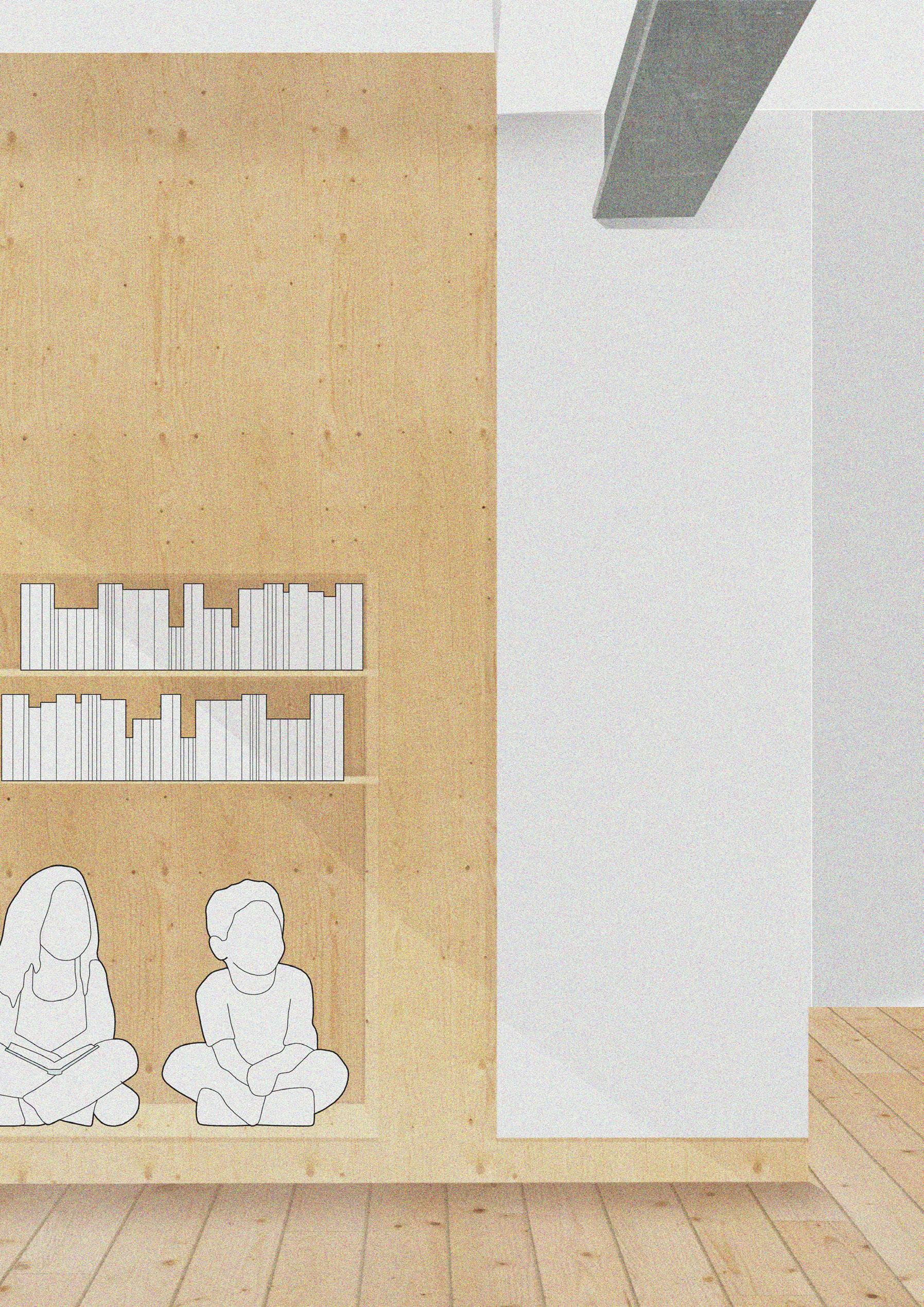 Collage représentant différents matériaux employés dans le salon, et la reconversion d’une ancienne ouveture condamnée en une bibliothèque / assise pour les enfants