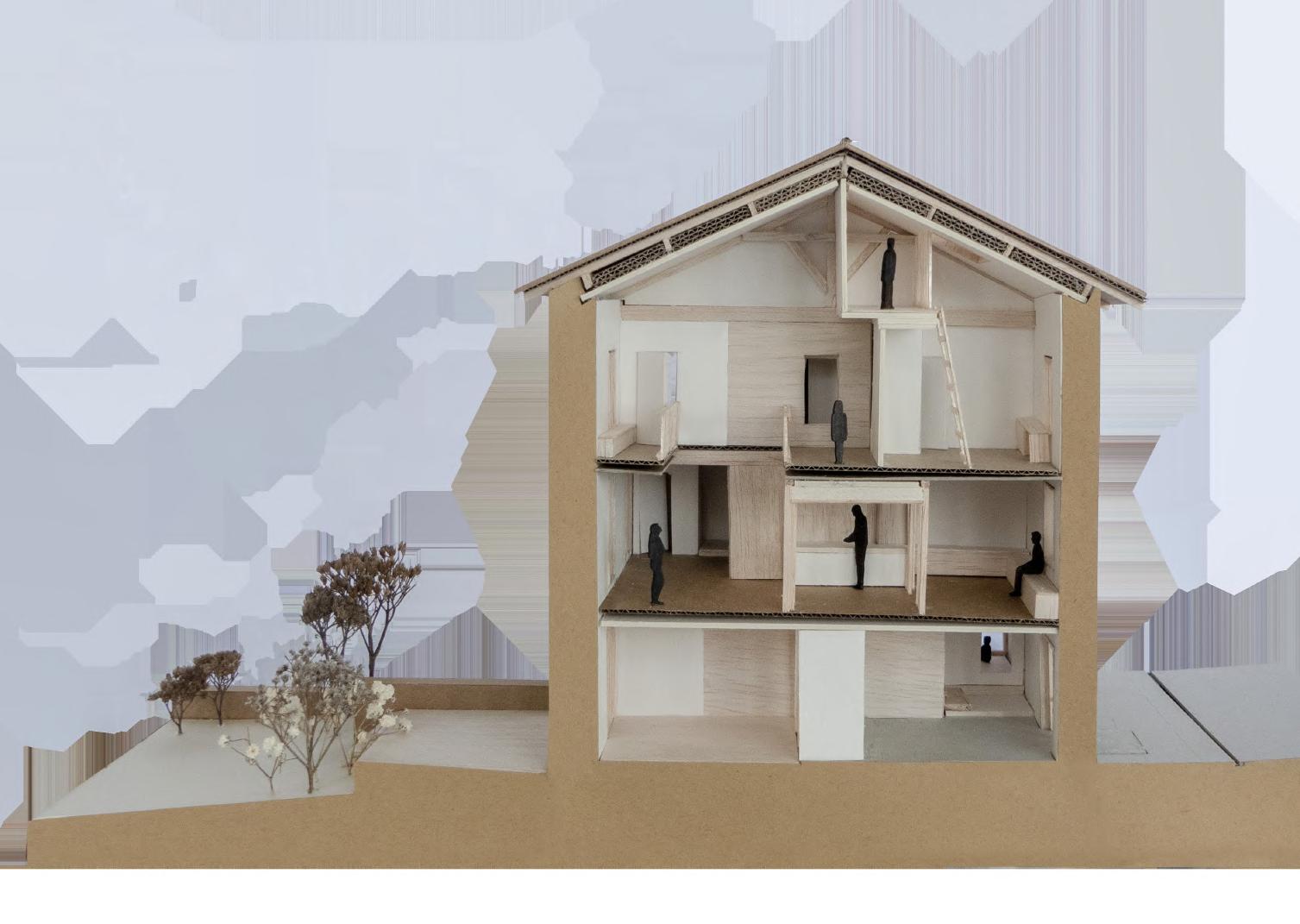 Dans ce contexte particulier, en 2050, le hameau n’a pas choisi de prendre la voie qui lui était déjà tracée. De nouveaux modes de travail, de consommation et de déplacement, entraînent les habitants à un train de vie plus local. Quant à l’ancien modèle d’habitat pavillonnaire, il est remis en question. Le logement fait désormais cohabiter les usages. Travail et habitat s’établissent en un seul lieu. Mais un idéal subsiste. La maison et son jardin, achat d’une vie, restent le rêve de nombreux foyers. C’est dans cet habitat que les individus vont connaître différents cycles de vie. Ainsi, le projet présent propose des logements aptes à évoluer selon les besoins et le rythme de vie des habitants.