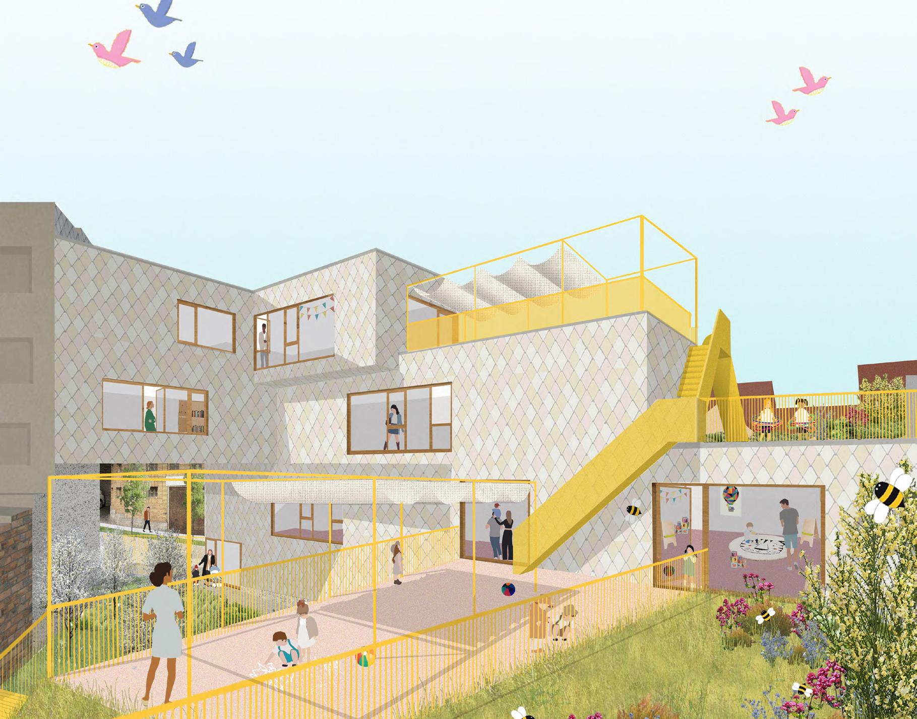 Collage d’ambiance, des espaces extérieurs. Concours pour la réhabilitation d’un ancien garage automobile en crèche, commune de Schaerbeek, Belgique.