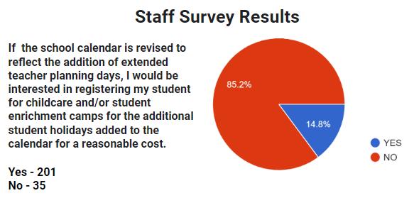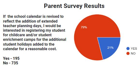 The attached proposed revised calendar is the result of stakeholder input gained through surveys, informational meetings, and stakeholder committees. The results of the most recent parent and staff surveys are included in this newsletter. Affordable childcare options for the additional teacher planning days are being researched and more information will be forthcoming. Please note that we have provided the same proposed revised calendar in two different formats. One contains the details on where the additional teacher planning days fall. The other calendar is the proposed revised student calendar shown in the familiar format.