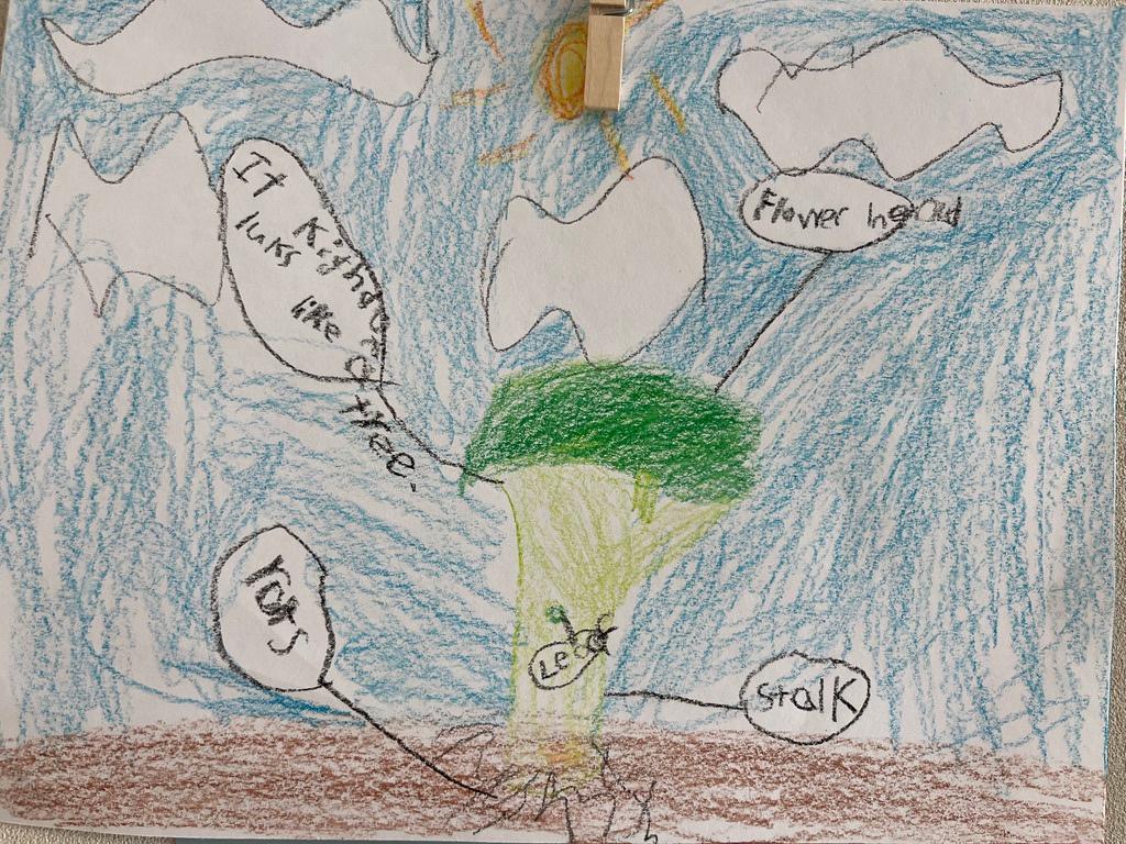 They have planted seeds and seedlings, observed, explored, and gathered produce from their outdoor garden. This week they also used Merge Cube, an augmented reality device, to investigate different parts of plants in 3D. Then, they drew detailed pictures of what they learned, using the non-fiction feature of labeling.
