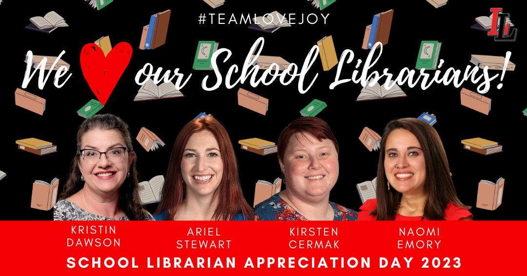 #TeamLovejoy loves our Library Media Specialists! Today, Tuesday April 4th is National School Librarian Appreciation Day and we are proud to celebrate Kristin Dawson, Ariel Stewart, Kirsten Cermak, and Naomi Emory! We are grateful for this incredible team!