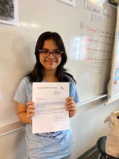 Earlier this year, our 7th and 8th-grade Creative Writing students had the opportunity to submit poems for the Mockingbird Poetry Society's 52nd Annual Collin County Poetry Contest. Willow Springs Middle School has 5 finalists! These students will be recognized on April 23rd at the Annual Awards Ceremony. This is where they will find out if they received 1st, 2nd, 3rd, or honorable mention in the 7th and 8th-grade categories. Each finalist will be published in the Mockingbird Poetry Society's 2023 anthology of winning poems.
