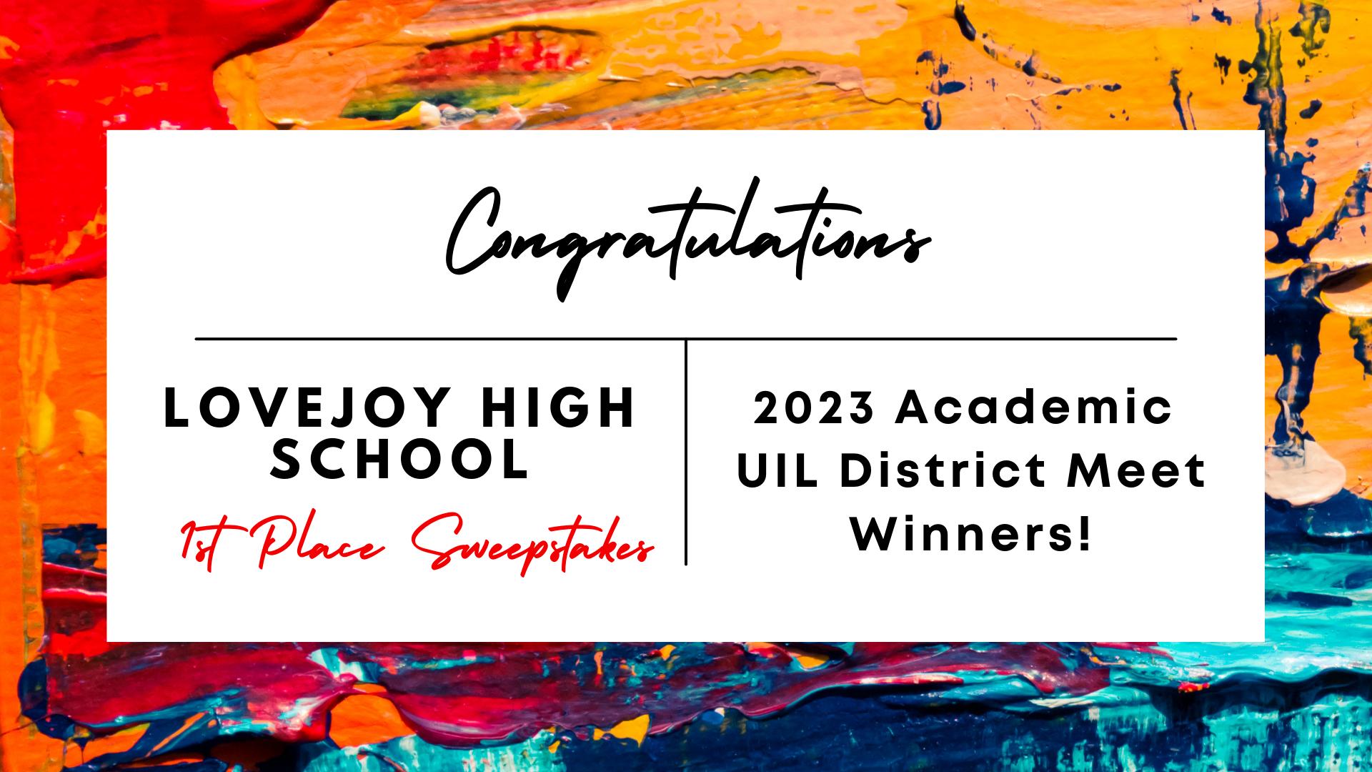 Congratulations to our 2023 UIL District meet winners! Regionals will be held at UT Arlington on April 21-22. A BIG thank you to Ms. Anderson (UIL Campus Lead) for all her hard work and for putting this information together. Congrats to all of our students and coaches on winning 1st place Sweepstakes!