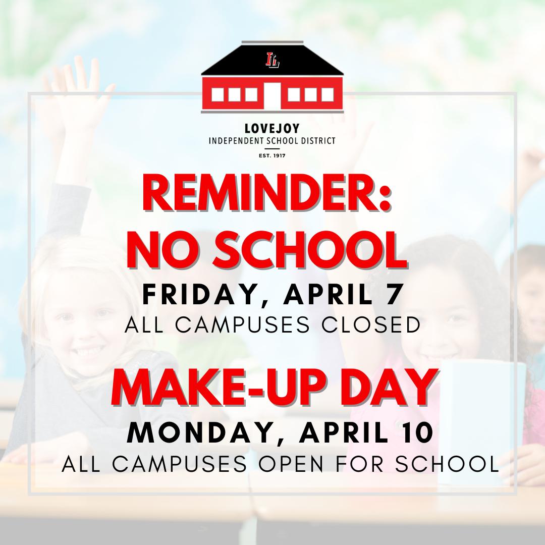 Tomorrow, April 7, is a school holiday, but we do have school on Monday, April 10th to make up for missing school due to inclement weather. We look forward to seeing our students on Monday and to finishing the school year strong.