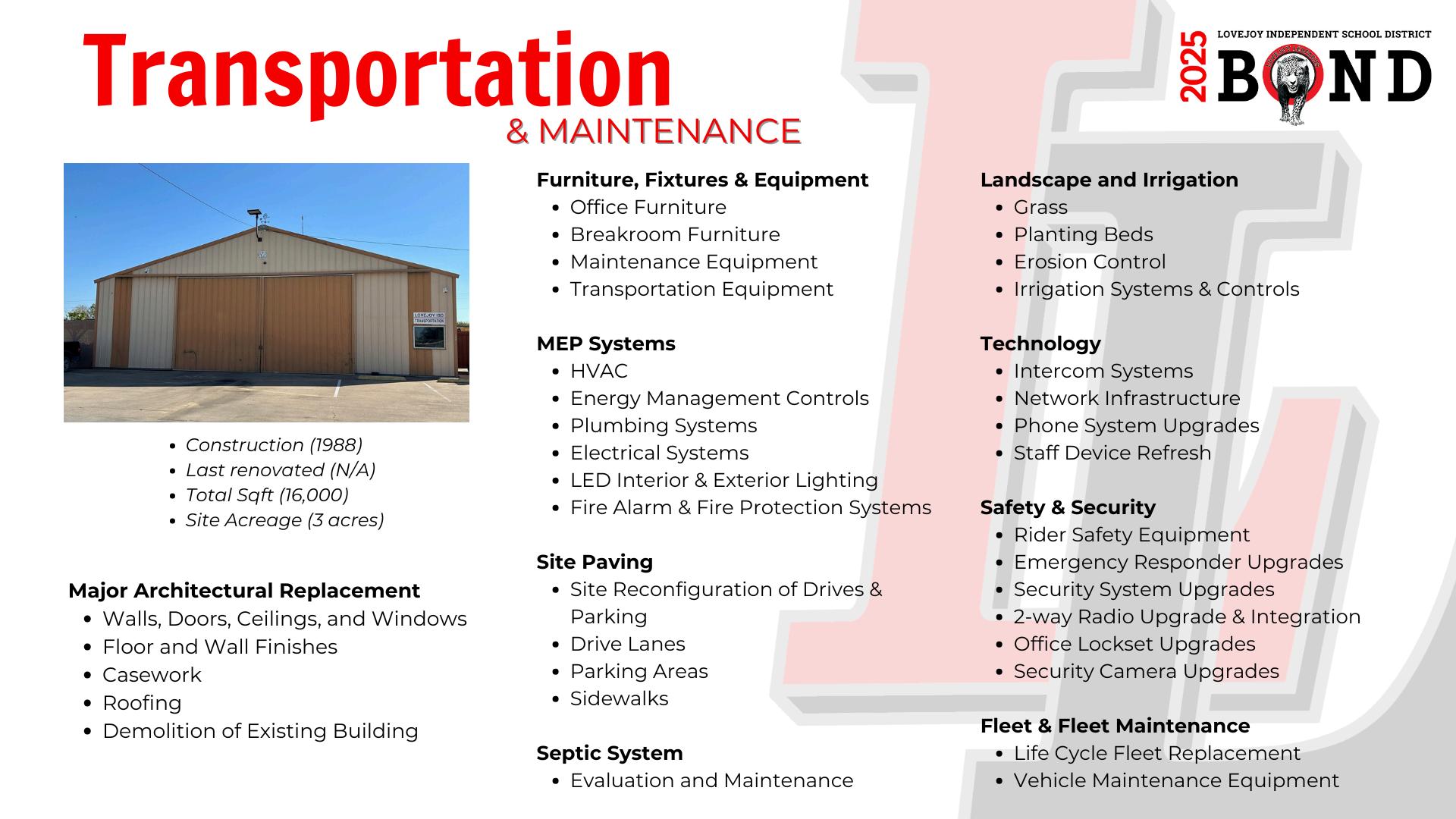 The2025BondproposalwillimpacteverystudentandeveryschoolinLovejoyISD with upgrades to major facility systems, technology, and safety and security. Bond projects also include updates to instructional learning spaces at Hart Elementary and Lovejoy High School, supporting a variety of learning experiences. Career and Technical Education courses, such as robotics, health sciences, and media will be modernizedtocreatereal-worldlearningenvironments.FineArtsprogramswillalso receiveupgradestoenhanceinstructionalandperformancespaces.