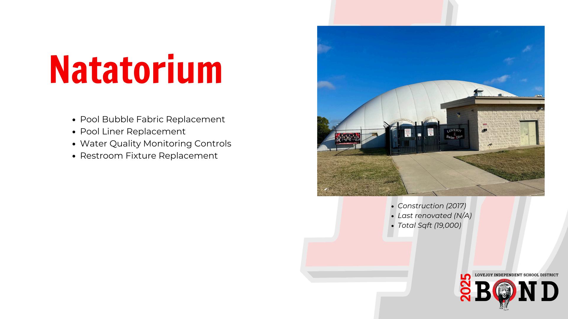 LovejoyISDwillhavefivepropositionsontheballotnextweek.The2025LovejoyISD Bond Package was developed by a community-based committee of 49 students, parents, and community members who met to study the instructional and operational facilities in Lovejoy ISD. After months of discussion, research, and collaboration, the bond planning committee finalized its recommendation to the BoardofTrustees.Thisbondpackageisbasedontheirrecommendations.