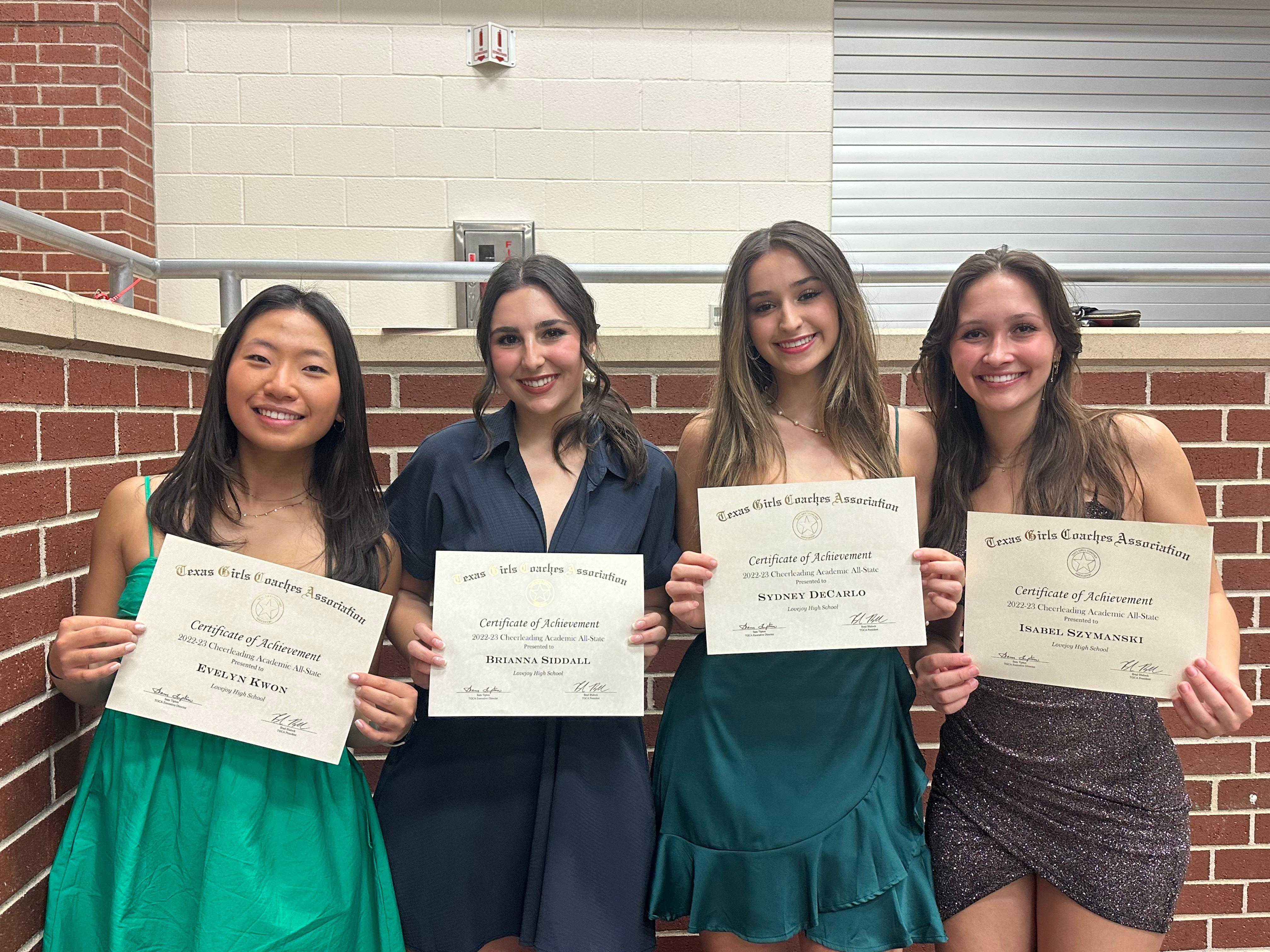 Please help us congratulate these Varsity cheerleaders for receiving recognition from the Texas Girls Coaches association, spirit Division. 4 Senior cheerleaders were named to the Academic All State 5A Squad by the TX Girls Coaches Association in the Spirit Division: Sydney DeCarlo, Brianna Siddall, Isabel Szymanski, and Evelyn Kwon. Izzy Szymanski and Evelyn Kwon were honored to be selected as part of the 5A All Star State Cheer Squad by the TGCASpirit Division.