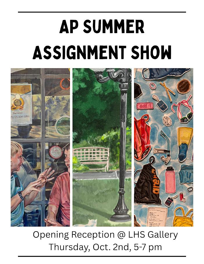 LovejoyVisualArtwouldliketoinviteyoutoour4thAnnualAPStudioArtSummer AssignmentShowonOctober2nd,from5-7!Everysummer,LJVAAPStudioArtists exploreavarietyofpromptstostayinconstantpractice,experimentation,andto grow their personal voice in preparation for the creation of their body of work during the year. These Summer Assignments serve as prompts to guide problemsolving in design and creation through personal voice, media exploration, and sharpening of our artistic knowledge, technique, and skill. Please join us as we celebratetheseartists’practice,commitment,andfollow-throughinthisfantastic collectionofworkandideasfromthissummer.