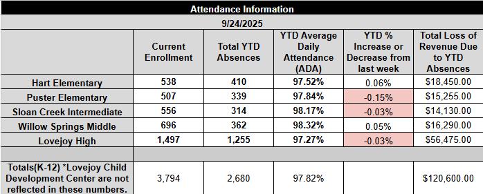 Strong school attendance is correlated with higher academic performance. Additionally,averageDailyAttendance(ADA)isametricthattheStateofTexas usestodeterminefundingforpublicschools.Eachweek,thisattendancedata willbeupdatedsoourcommunityisawareofourmostrecentADA.