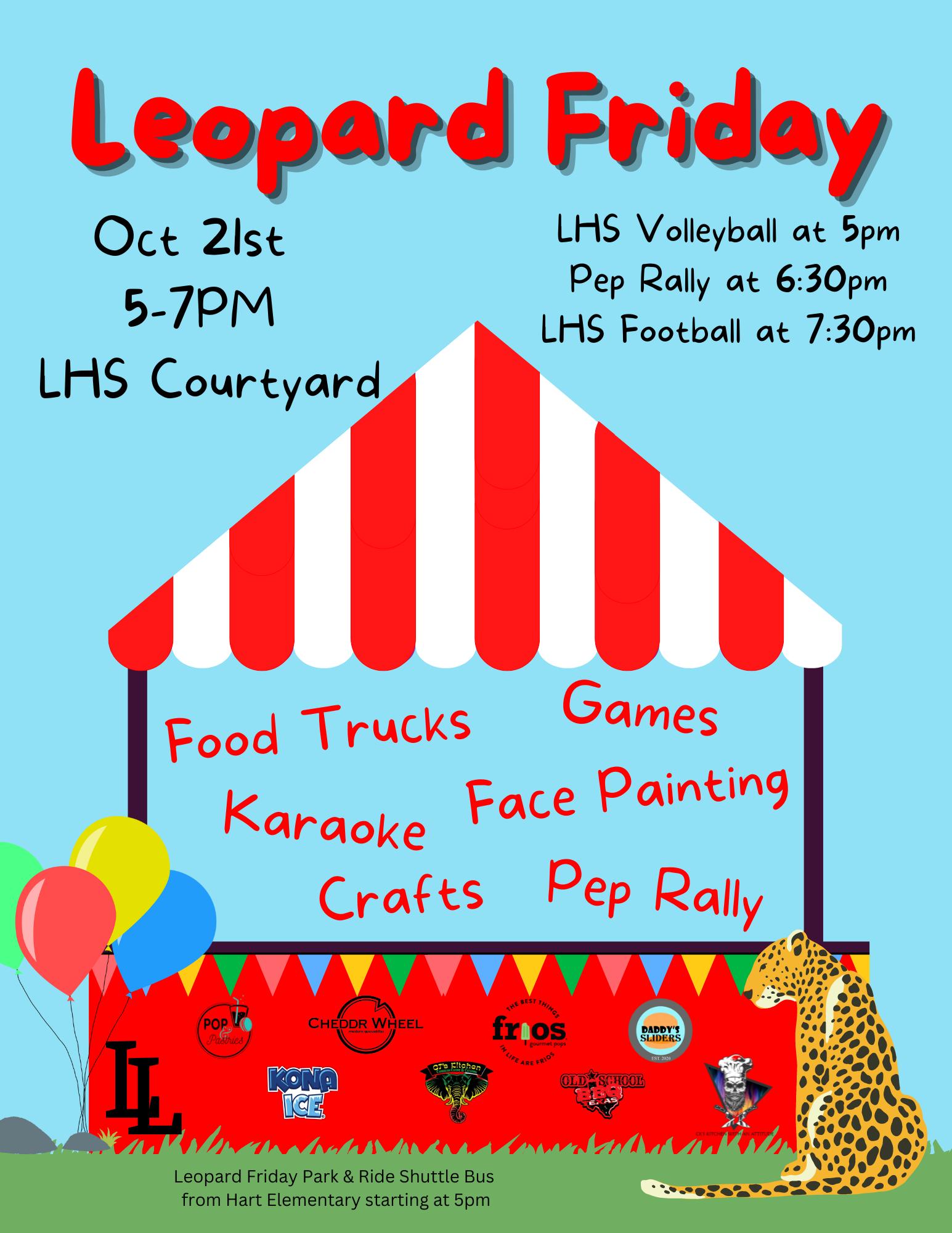 All Lovejoy Leopards are invited to join us for the annual 2022 Leopard Friday. Leopard Friday is a district wide fall festival hosted in the LHS courtyard. The LHS Booster Clubs and student groups will provide booths of fun activities and games for all ages and food trucks are available for a quick bite to eat. The Lovejoy Volleyball teams have games beginning at 5:30PM, there will be a community pep rally at 6:30PM with our Lovejoy Cheer and Fine Arts, and your Lovejoy Leopards kick off at 7:30PM for an awesome night of Friday Night Lights. Parking shuttles for Leopard Friday will run between Hart Elementary and LHS. Bring your family and enjoy the fun at our 2022 Leopard Friday.