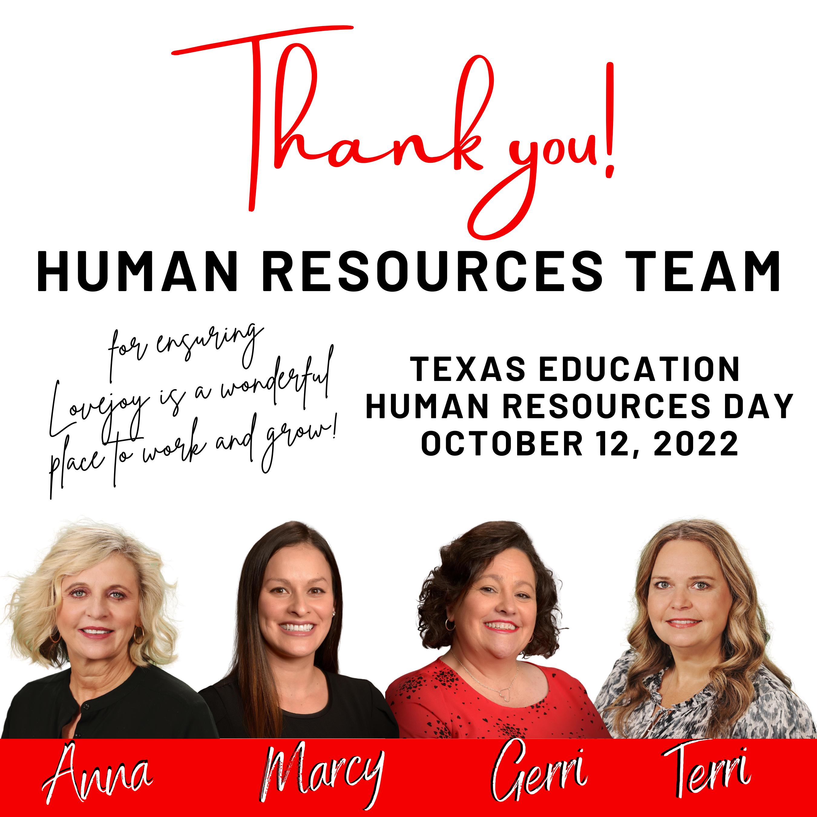 Join us in celebrating our fabulous Human Resources team! This group is dedicated to caring for our most valuable and important resources, our Lovejoy ISD teachers, staff, and guest educators! Hiring, onboarding, training, benefits, compliance, and staff appreciation are all just some of their areas of expertise. We appreciate you, Human Resources!