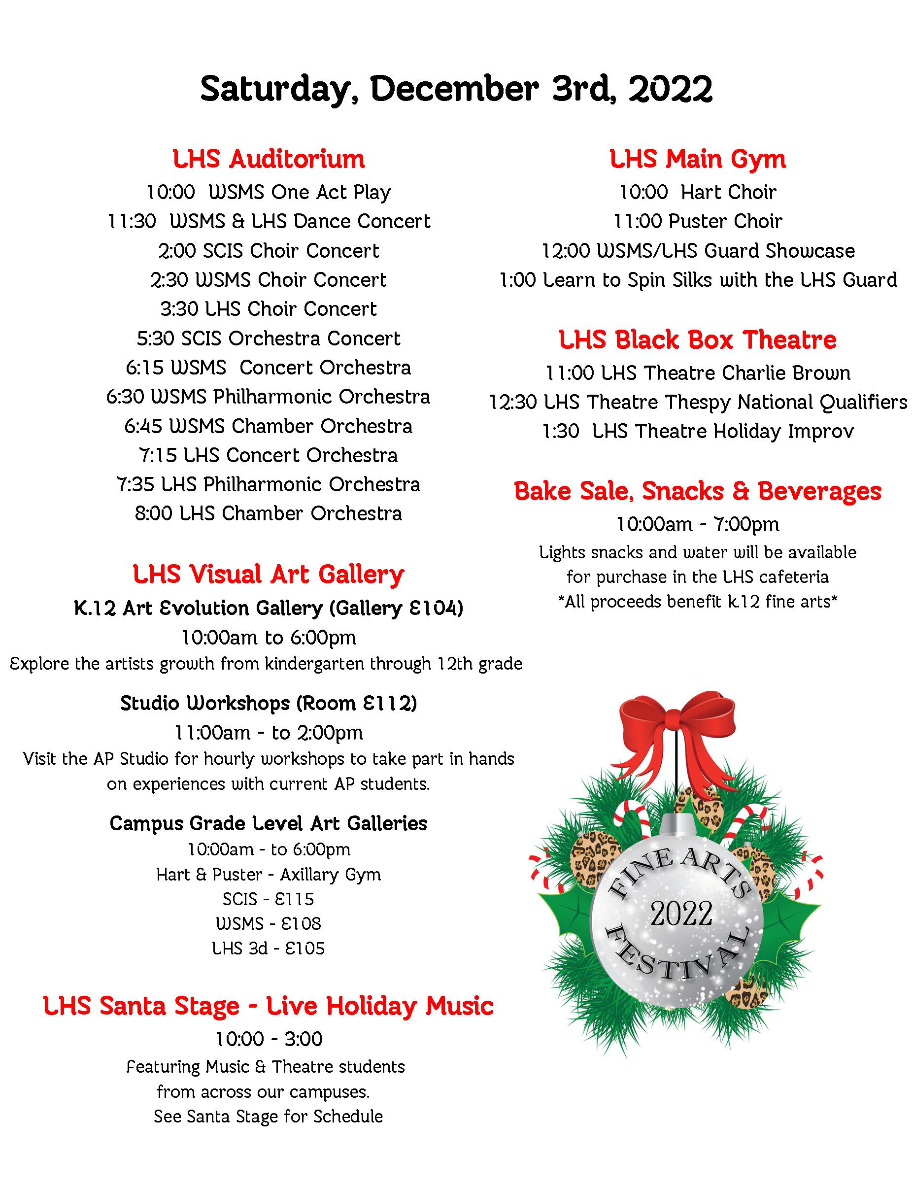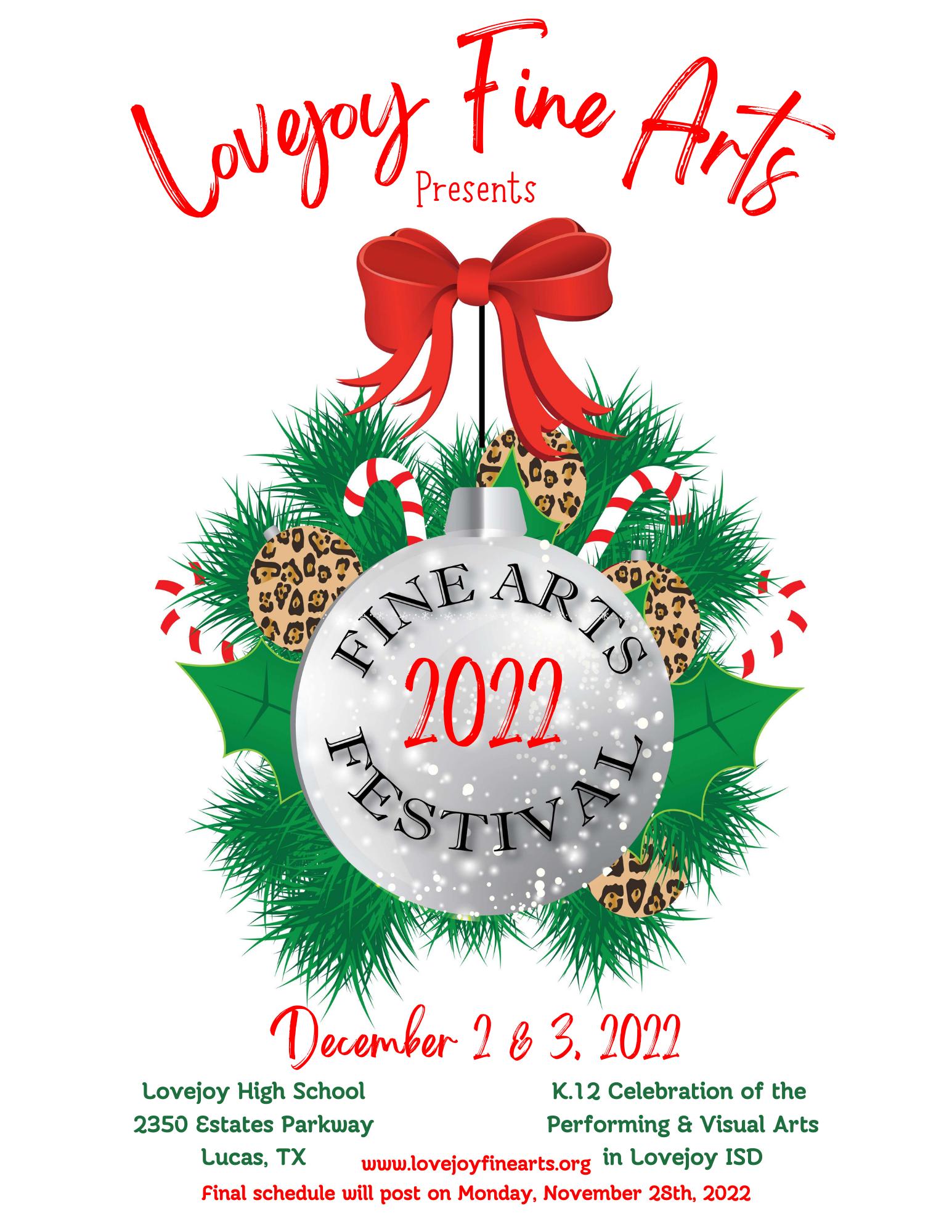 I invite you to attend our annual Lovejoy Independent School District Fine Arts Festival. Our annual Fine Arts Festival takes place today, December 2nd from 5 p.m. 7:30 p.m., and tomorrow, Saturday, December 3rd, from 10 a.m. 9 p.m. at Lovejoy High School.