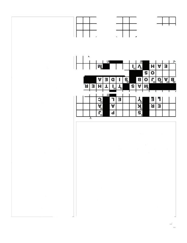 ACROSS DOWN 1. Tinted 5. Junkyard junk 10. Coffee, informally 14. Say it isn’t faux 15. Aussie “bear” 16. One who raised Cain 17. “Out” to an editor 18. Any Dogpatch character 19. Manage somehow 20. Careless pedestrian 22. Canton neighbour 23. Female parents, for short 24. They donate a tenth 26. Illegal entry by a government agent 30. Featured half of a 45 31. Black-and-White cookies 32. Bed-and-breakfast 33. It might be rigged 37. Wife of Jacob 38. Sign of late summer 40. “The Ghost and Mrs. ” 41. Repair sock holes 42. Suffix for “hero” or “rout” 43. “Slowly” in music 44. Trustingly innocent 46. Bow 47. Nineveh was its capital 50. Purchase add-on 51. Do a winter chore 52. Longshoreman 58. Lab heater of old 59. Instrument of anf etude 60. Hectic episodes 61. It can be good, bad or rotten 62. Lethargic sleep 63. Easy win 64. Harmless sword 65. Hard to combine, chemically 66. Long basket, in basketball 1. Pilgrimage to Mecca (var.) 2. Colored part of the eye 3. Lampreylike 4. Barrymore of “E.T.” 5. ‘70s Earth orbiter 6. Proverbial broth spoilers 7. Autumn tool 8. Emulating Paul Revere 9. Trusted chum 10. Pavement pounder 11. Love deeply 12. Word with “lock” or “barrier” 13. Sunday approvals 21. Andy’s radio partner of old 22. Breakfasted, e.g. 25. Fig. on a driver’s license 26. Attention-getting type 27. Atlas stat 28. Neutral or reverse 29. Cornbread on the griddle 30. “Yes Bob!” 34. Cousin bearer 35. Uses a pew 36. “Iliad” city 38. Two-by-four in 56-Down 39. Military incursion 43. High-class 45. “All bets_ off’’ 46. Go on a gamboling spree 47. Big name in pop music 48. Prepare 49. Continuously from 50. High male singer 53. Eight-track, e.g. 54. Arrow cousin 55. Household spray target 56. “Julius Caesar” setting 57. Catch a glimpse of 59. It’s shaped like a trident 26