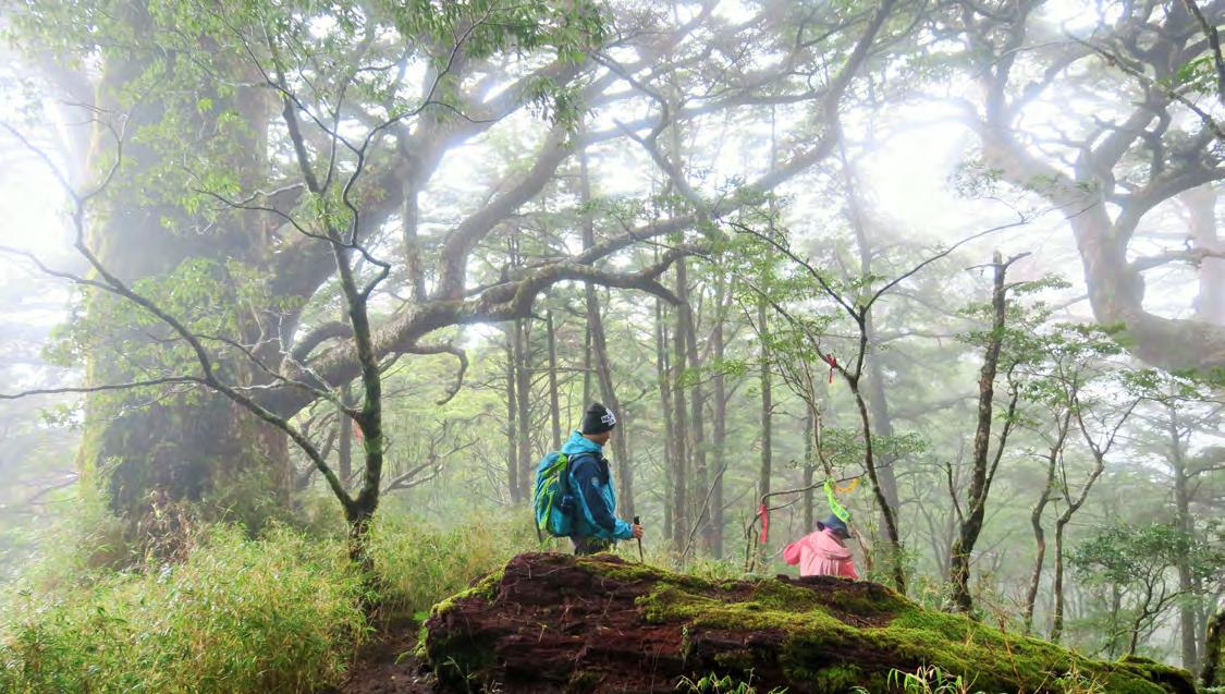 起大背包循著陡徑緩緩前行,穿梭在 針闊葉樹混合林中,享受山林的幽深