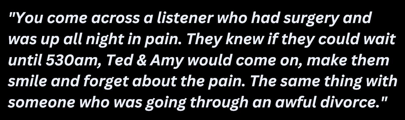 TheCOVID-19pandemicpresenteduniquechallengesfor theradioindustry,withreducedcommutingandchanges indailyroutines.However,RobbinsandLongremained committedtotheirlisteners,recognizingtheneedfora constantpresenceduringuncertaintimes.Theywere touchedbymessagesfromlistenerswhoviewedtheir showasasourceofstabilityandlightduringthedarkness ofthepandemic.Amyshares"Iwasactuallyworking fromhomeforalmostayearandahalf.Tedwashere everyday.Wereallyfeltlikewehadtobeontheair becausewehadtobethereforpeople,andtalkabout whatwasgoingon.Attimeswewonderedifanyonewas listening!Butthensomeonewouldwriteorcallinand thankusforbeingabeaconoflightduringaverydark time."