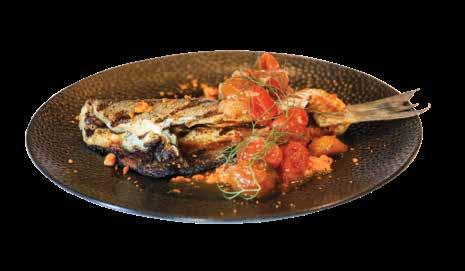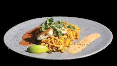 Chip Richards’ Baja flounder. This delicious local fish is seared and served over Mexican street corn, a chili lime aioli and andouille jam.