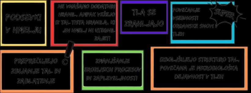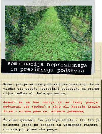 Našteje tudi različne vrste podsevkov, ki jih je priporočljivo sejati v hmeljiščih in so že podrobneje opisane na predhodnih straneh. Prav tako pa je povzel ključne zahteve podsevkov v hmeljišču, ki se osredotočajo na pokritost tal v medvrstnem prostoru (po spravilu do najmanj 30. 9.), setev, ki naj bo opravljena do 25. 7. in pa izbira čistih setev ali mešanic.