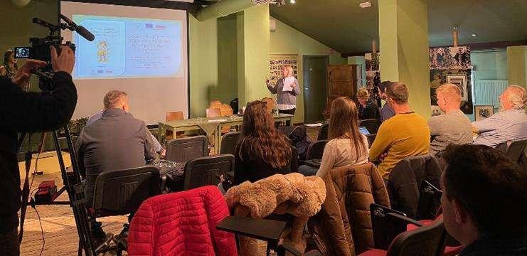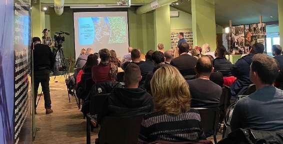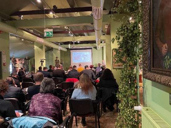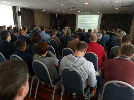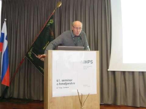 Na fotografiji je g. Puklavec s posestva Jeruzalem Ormož na seminarju o hmeljarstvu v Portorožu med predavanjem o njihovih izkušnjah in praksi glede podsevkov.