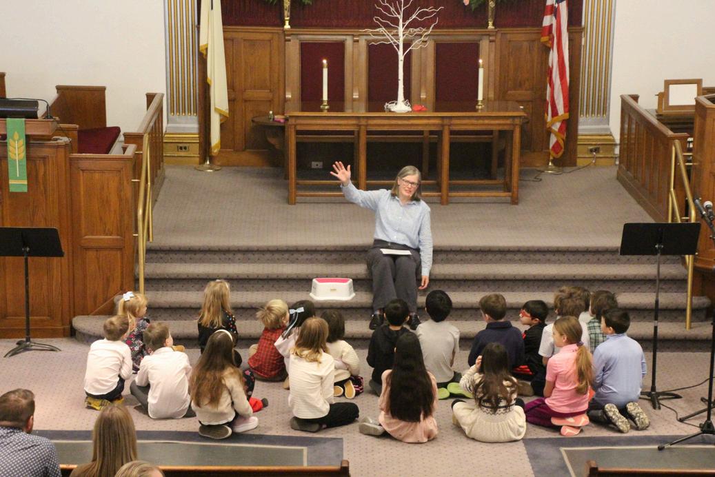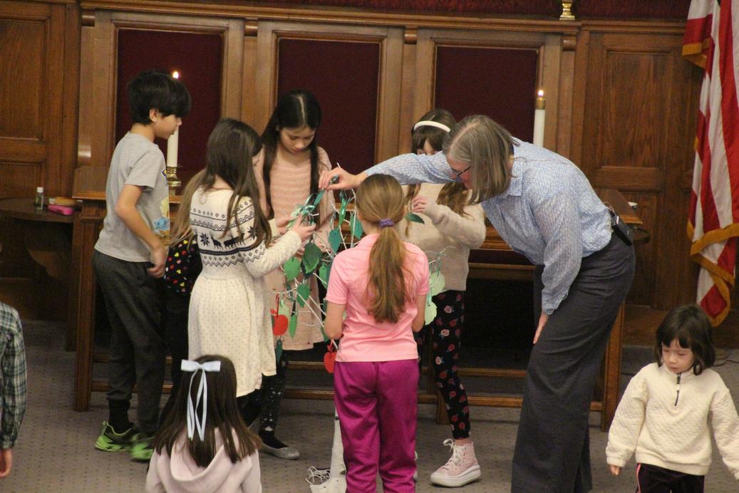 On Children’s Sunday, LPPC truly “shined” as an intergenerational church More than 25 children joyfully took part in every aspect of the worship service greeting people as they arrived, handing out bulletins, helping to write the prayers, collecting the offering, and leading music. All of the children also participated in a closing activity, bringing leaves from the congregation forward to hang on the tree at the front of the sanctuary. MaryAnn Alderfer, Director of Children’s Ministry, taught about Jesus and Zacchaeus and invited the congregation to pay attention to others as Jesus did, reflecting on how God’s love changes hearts.