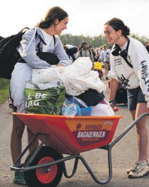 We zijn los! Muziekliefhebbende veelvraten, cultuursnuivers, nachtdieren en feestbeesten hebben hun tijdelijke thuisbasis in de polder ingericht. Meer goed nieuws: het leed dat bagage sjouwen heet, is vele Lowlanders bespaard gebleven dankzij de HORNBACH Bagagewagen. Tenten, tassen en andere onmisbare (?) items verdwenen in de oranje kruiwagens en werden met minimale inspanning richting festivalcamping gerold. Esmee (23) uit Leiden maakt gebruik van deze service van HORNBACH om boodschappen mee te vervoeren. ‘Wat een uitvinding ... Ik wilde een bolderkar kopen, maar dit is véél handiger.’ Ook de Hilversumse Ieke (19) en Koosje (21) hebben geen zin om energie te verspillen aan gesleep met spullen. ‘Onze vriendinnen zijn vooruit met de tenten en wij lopen er met zware spullen achteraan.’ Of de kar meteen retour gaat? ‘Nee, joh. We laden de wagen zo nog een keer vol!’ Tip (al moet je er nu nog niet aan dénken): ook voor de terugreis staat de HORNBACH Bagagewagen paraat. Op zondag en maandag, bij de polsbandjestent of bij de nieuwe supermarkten ter hoogte van Camping 1 en 4. (JB/KD)