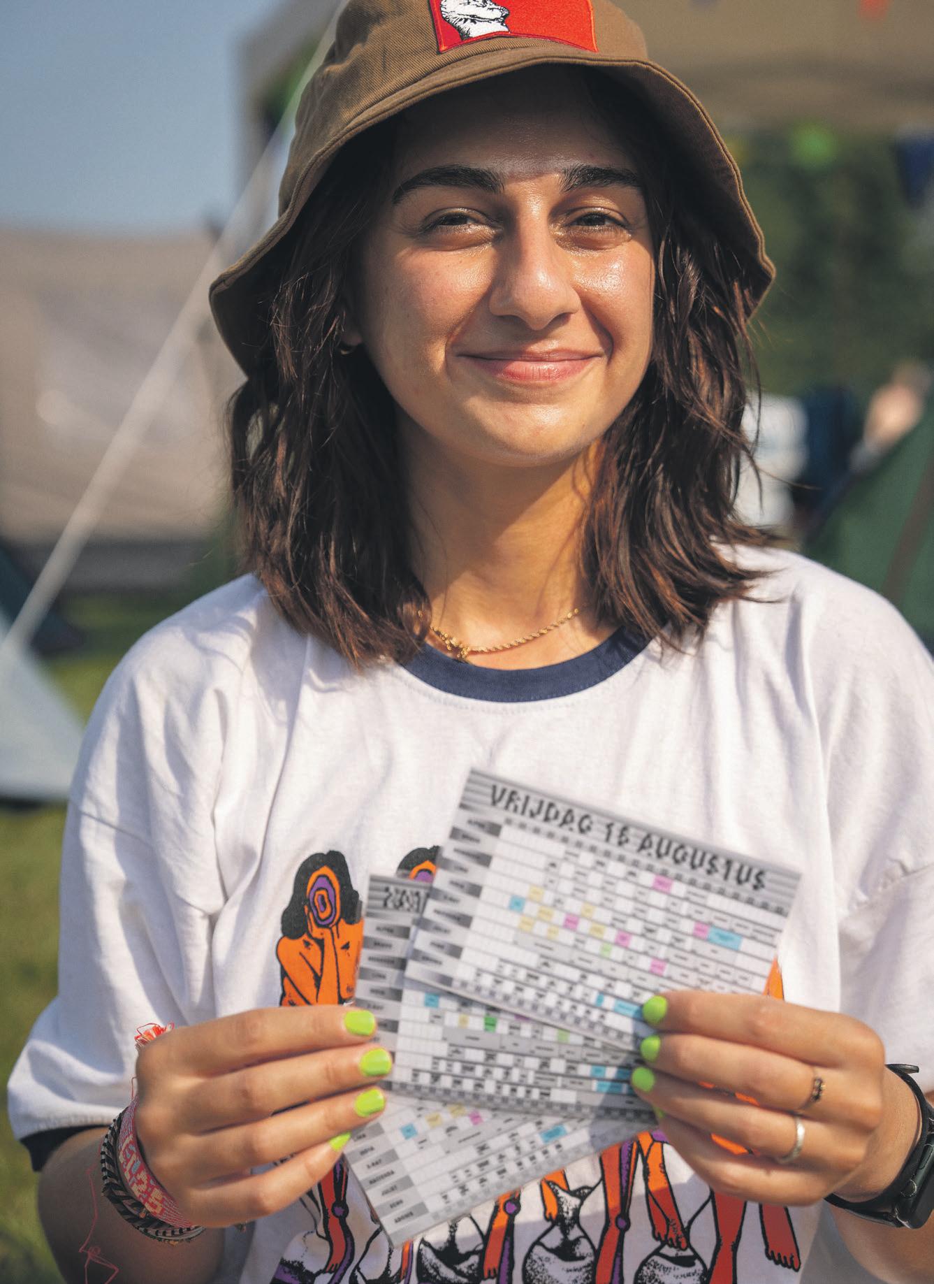 Dj, podcastmaker en festivalfanaat Vera Siemons kon zich geen spannender begin van LL25 voorstellen: draaien in een volle Bravo tijdens de Lowlands Headphone Disco. Samen met compagnon Liza van den Brink liet ze het publiek gisteren al zwetend losgaan op hun set vol hiphop- en housebangers. ‘Al de hele week ben ik hyped. Ik heb al m’n nagels afgebeten, want ja: het is wel de Bravo!’ Terwijl ze haar stinkende best doet om de groene koptelefoons te laten domineren, weet ze dat haar vriendin en muzikale tegenhanger, die gelijktijdig in India draait, luisteraars probeert te lokken. ‘Als er meer mensen blauw kiezen, moeten Liza en ik aan de bak.’ Vandaag zet Siemons zich schrap voor nóg meer feest: vanaf middernacht draait ze met Van den Brink bij ICONIC in Lima een dansnacht vol queer anthems, Chappell Roan, dragqueens en dansers. Én een surpriseact: ‘Een lesbisch icoon komt optreden – een Nederlandse dame van in de twintig die net een zomerhit heeft gescoord.’ (FH)