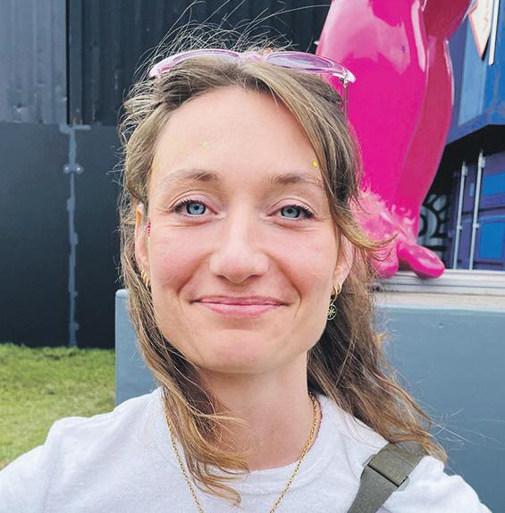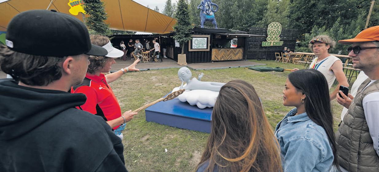 richting een gigantische mond beweegt. Hij siert het dak van een hamburgertent. Het origineel, gemaakt door ShiSoH, leggen de twee uit, was van frituurvet gemaakt, maar een kunstwerk op Lowlands moet de elementen kunnen doorstaan. Dit exemplaar is daarom van plastic. Verwacht van in Art Tours geen verhandelingen die je weer doen verlangen naar je klamme slaapzak, maar korte, toegankelijke uitleg. ‘Als we aan een groep duidelijk kunnen maken dat Lowlands meer is dan muziek en genotsmiddelen, dan zij wij blij.’ (MG)