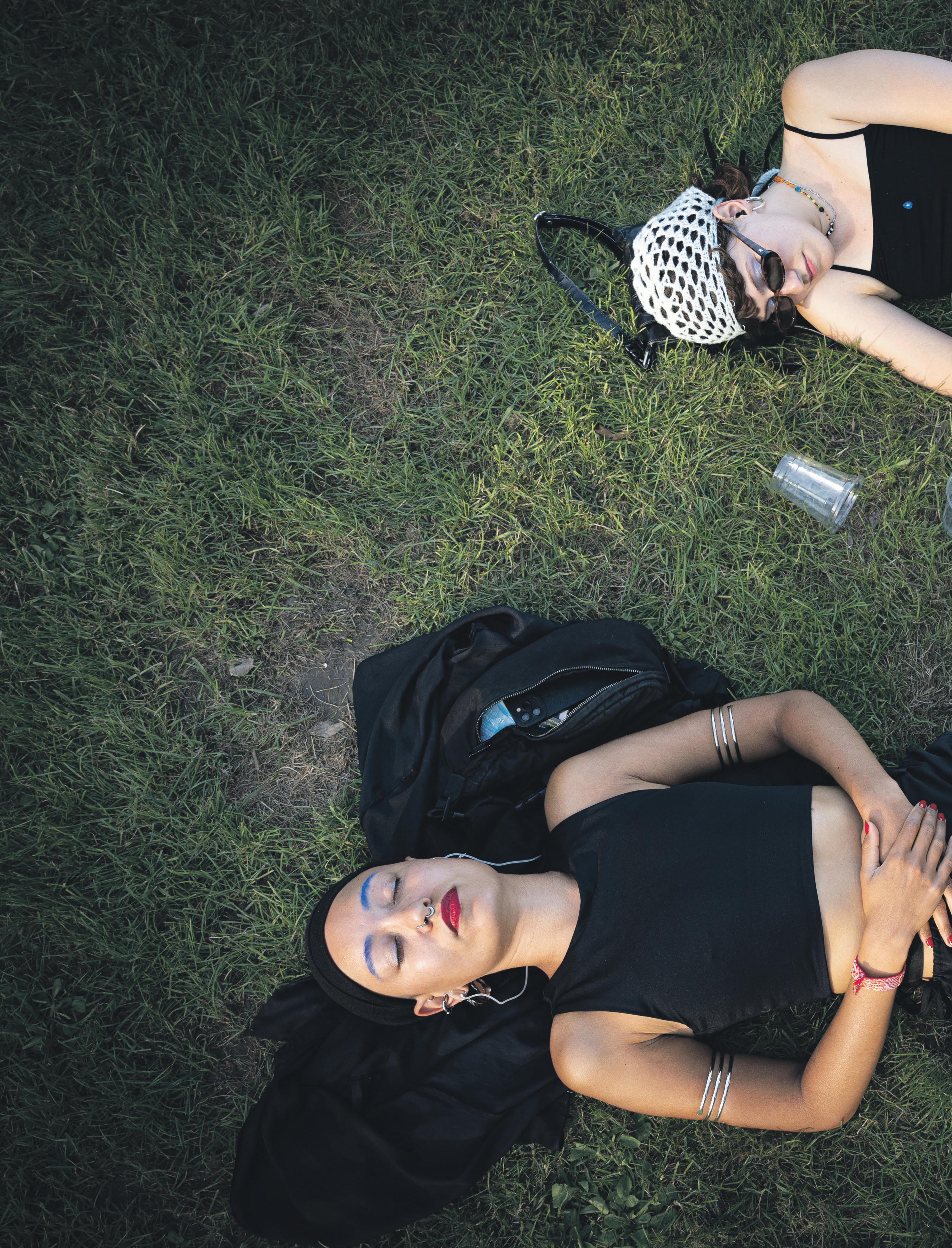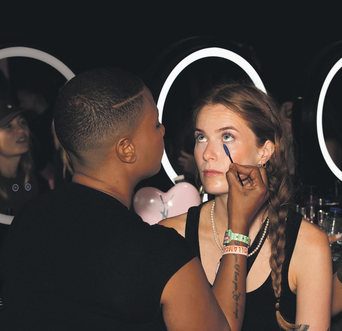Op de hoek van de LLakeside Market schittert de YSL Beauty Light Club, strak en chic zoals het een Frans modehuis betaamt, met neon vloer. Dé plek om danszweet en glitterresten van de nacht ervoor te verhullen. Weg wallen; met de kleur ‘festivalplatina’ op je gezicht krijg je vanzelf een glossy glow. Een vleugje felblauwe mascara en gloss op de lippen en je bent klaar voor de catwalk tussen Bravo en Heineken. Alexandra (31)
