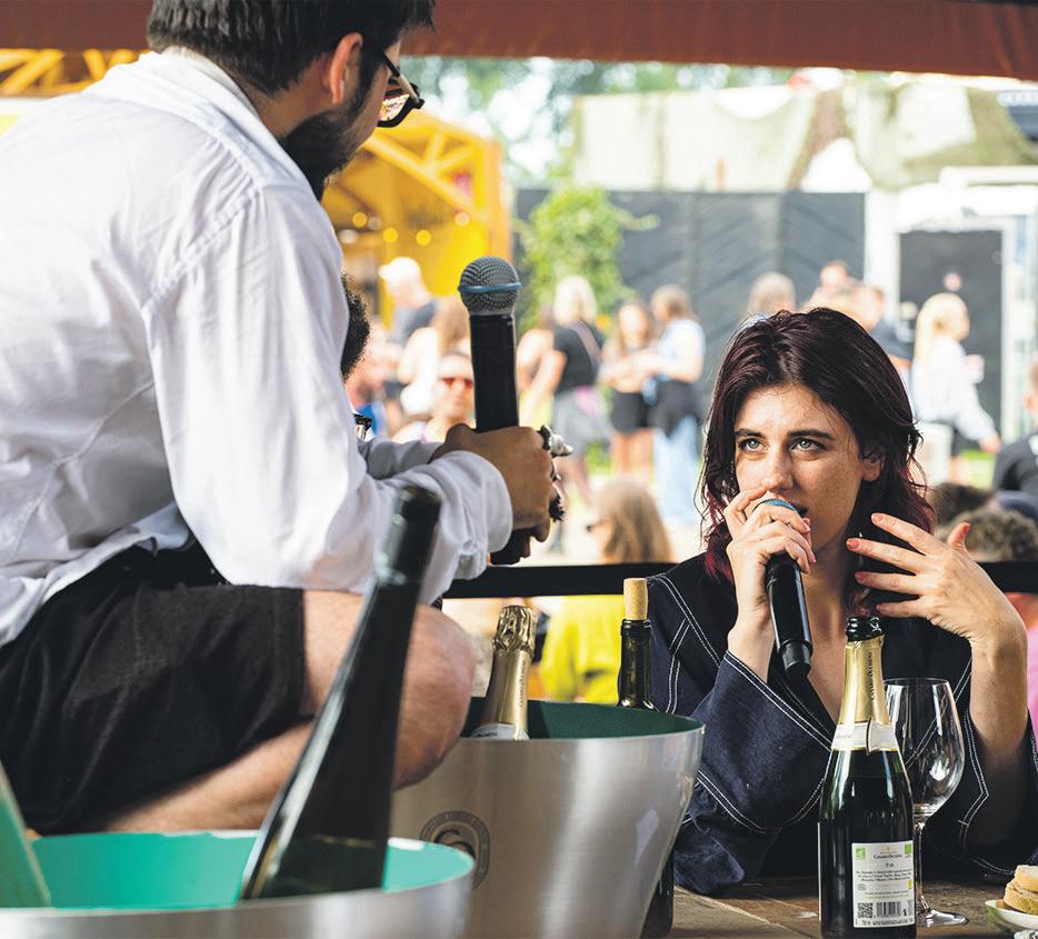 Volle glazen en een gezelschap vol genode gasten bij Wine Slow, de middagtalkshow van Lowlands’ wijnman Cesar Majorana . Het perfecte recept voor de nodige wijnverhalen. Wie wist dat zangeres Sylvie Kreusch uit een wijnfamilie komt – en zich er juist jarenlang van afkeerde? ‘Pure afzetterij’, grinnikt ze tegen Majorana, die met zijn laarzen nonchalant over de enorme houten tafel stapt om iedereen bij te schenken. Ondertussen bewijst schrijver Martin Rombouts dat hij een feilloze tong heeft; hij onderscheidt zo de Duitse sekt van de drie keer duurdere champagne. Aan de zijlijn proosten Marit (24) en Myra (25) vrolijk mee met hun glaasje rosé, een traktatie van de talkshowhost. ‘Bij mij kun je natuurlijk niet droogstaan.’ Tot hun eigen verbazing krijgen ze na afloop zelf de bubbeltest. En jawel: unaniem kiezen ze de dure champagne. Myra grijnst: ‘Misschien ben ik toch de verloren dochter van Ilja Gort.’ (KD)