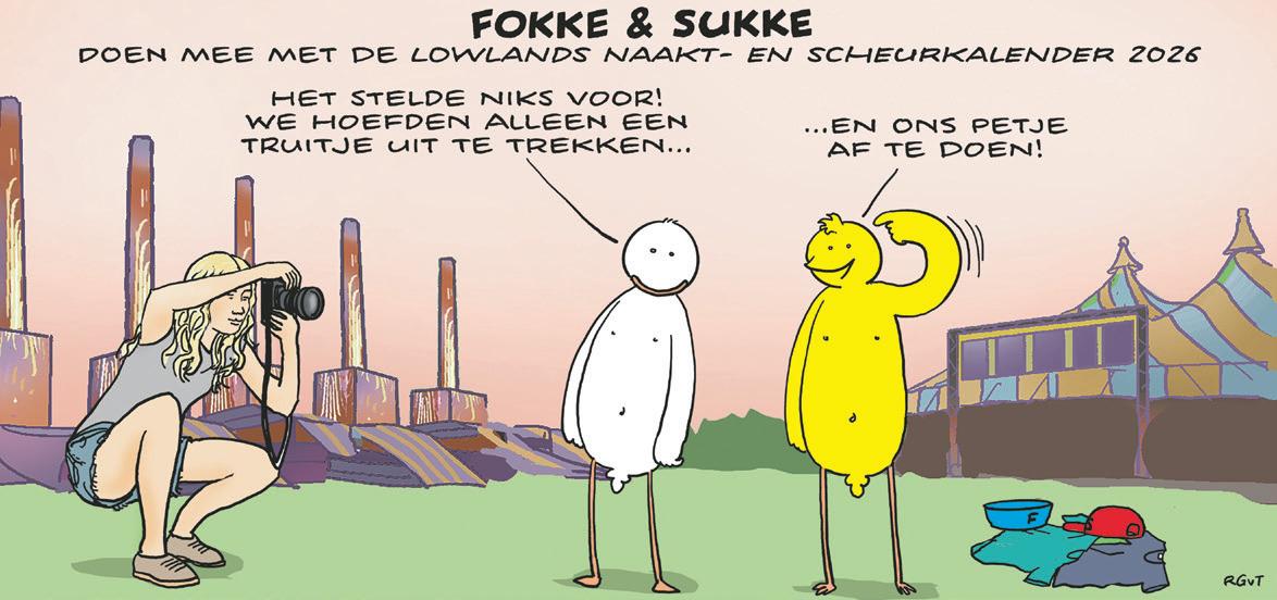 Net als Philip (31) en Marah (31) ook in de Lowlands Naakten Scheurkalender 2026 door Lara Verheijden? Loop langs bij de kiosk naast het Ohlalalaantje en plan je shoot!