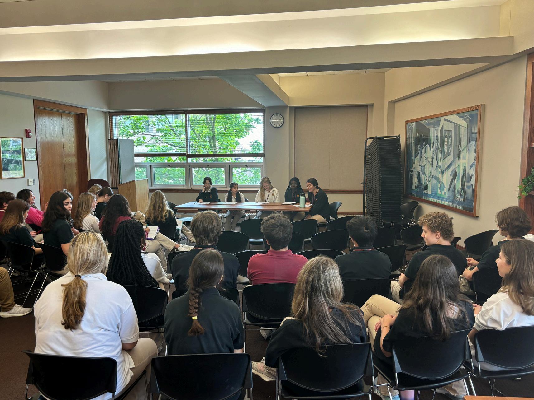 Karen Asante '24 and Michelle Boaitey '24 then highlighted the four quilted banners hanging in the gym, explaining the importance of quilting as a creative outlet for enslaved women to express their identity, agency, and legacy in a time when it was illegal for them to read and write. For more than 400 years, quilting has allowed African Americans to preserve their community, family, and culture.