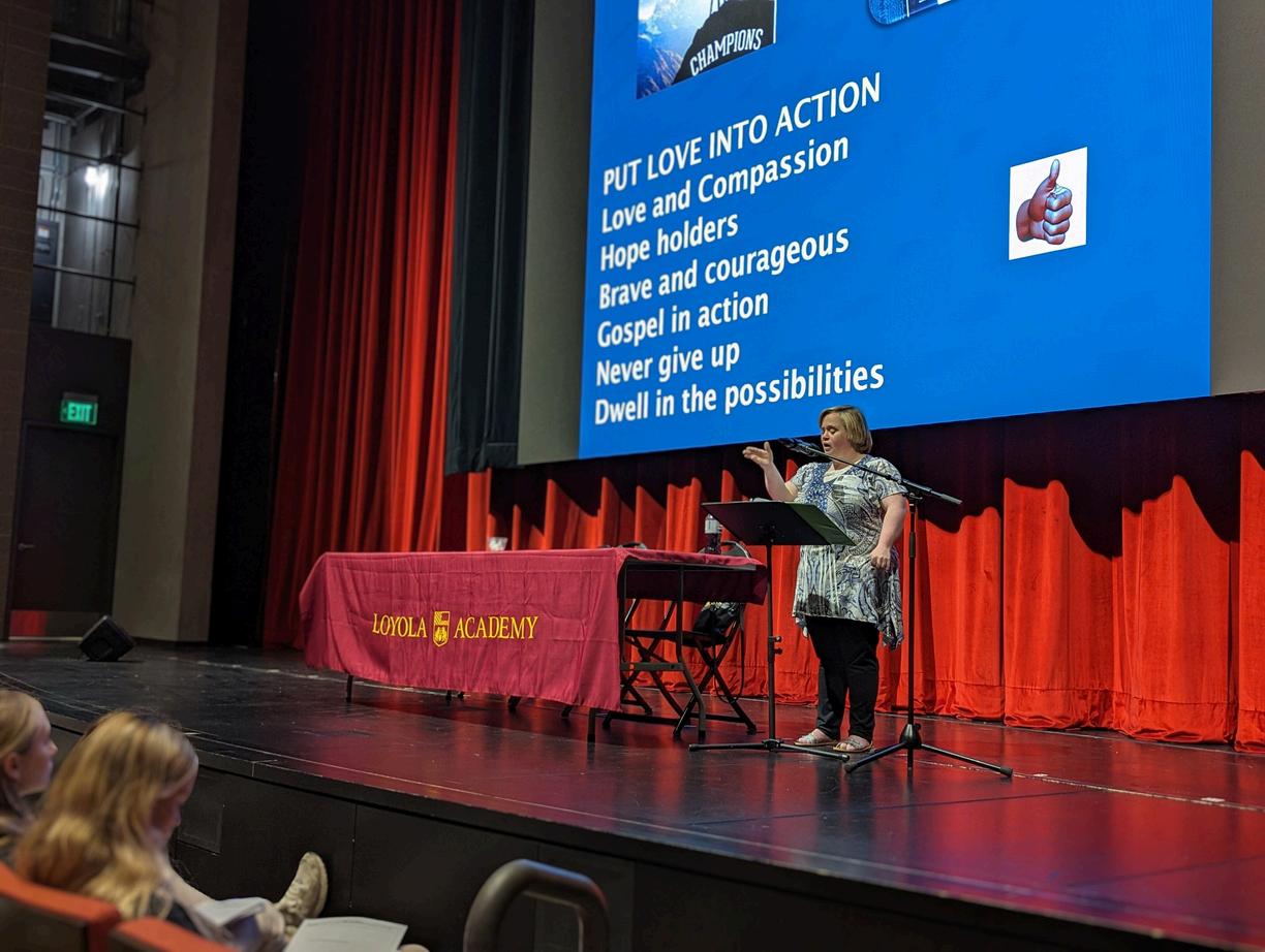 Alexandra C. "Alex" Gambacorta '14 presented her archival project "Opening the Archive, St Charles Mission School" at Marquette University on February 6 as part of Marquette's Mission Week programming Alex graduated from Marquette in 2018 and subsequently joined the Jesuit Volunteer Corps Northwest, where she taught at St. Charles Mission School on the Apsáalooke Reservation in Pryor, Montana. Alex discussed her experience as a Jesuit volunteer and acknowledged the contradictions of participating in contemporary mission education. She explained how, in 2021, she returned to Marquette for her masters in English and, in 2023, launched her archival project. In attendance were current Loyola Academy students in Honors Native American Literature, taught by Mrs Colleen Whelan
