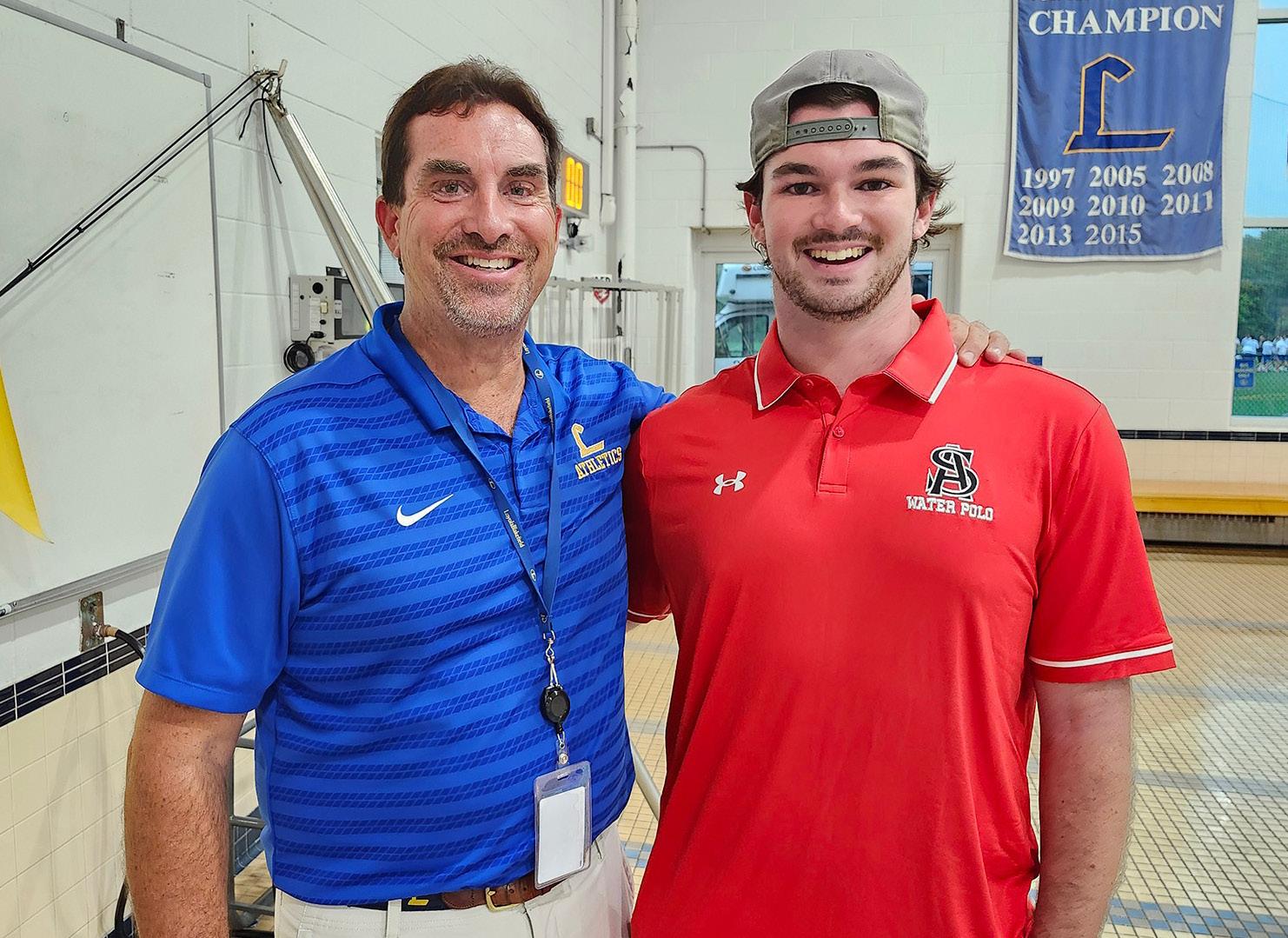 It was nice to see a familiar face on campus recently— even if he was wearing the wrong color! DANIEL PARR ’22 (pictured here with dad and Head Athletic Trainer Jeremy Parr) visited as an assistant coach of Archbishop Spalding’s water polo team.