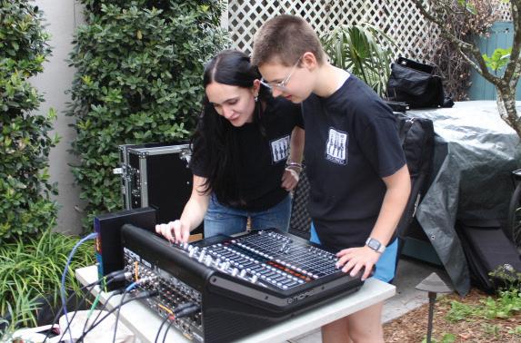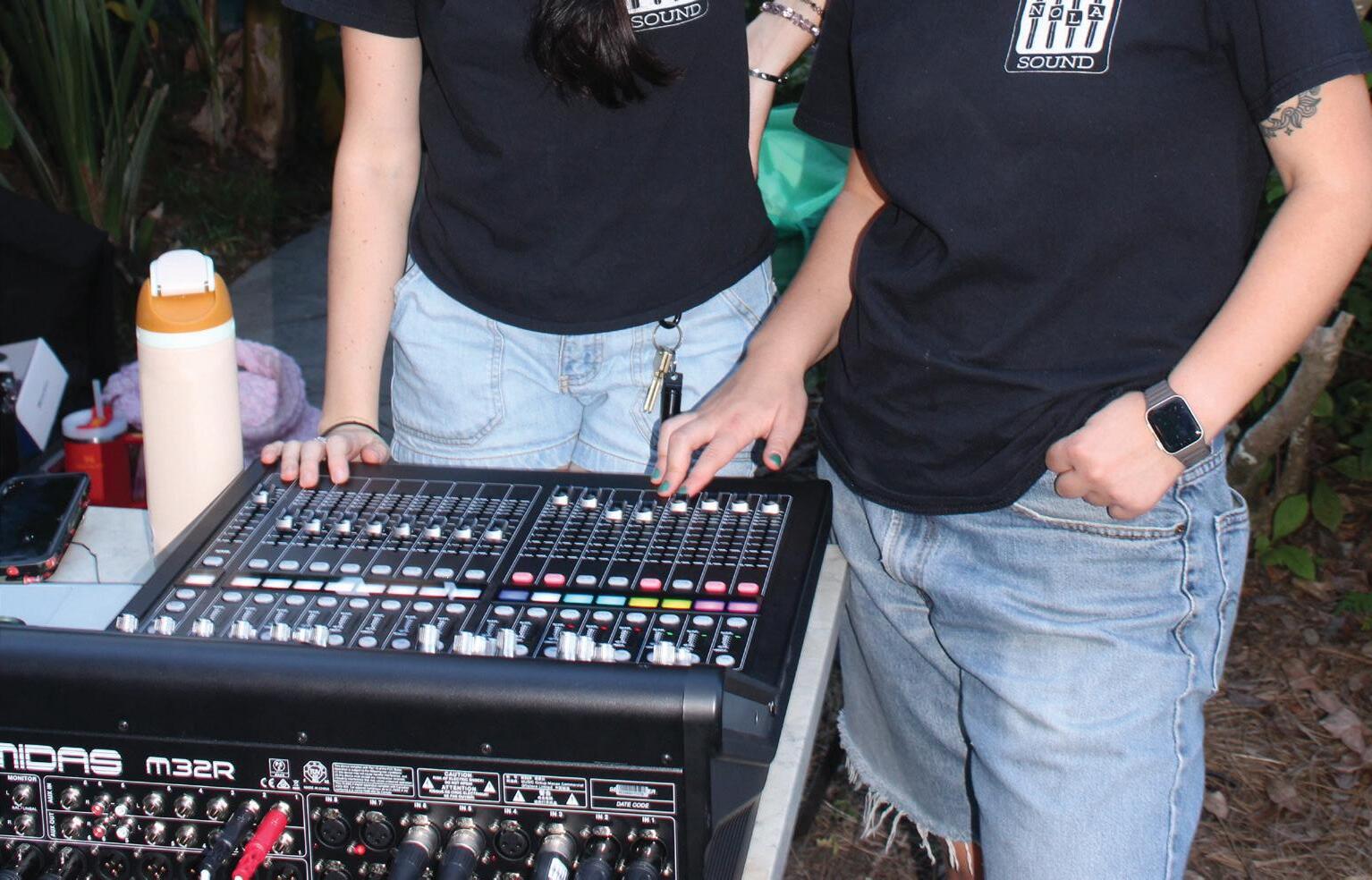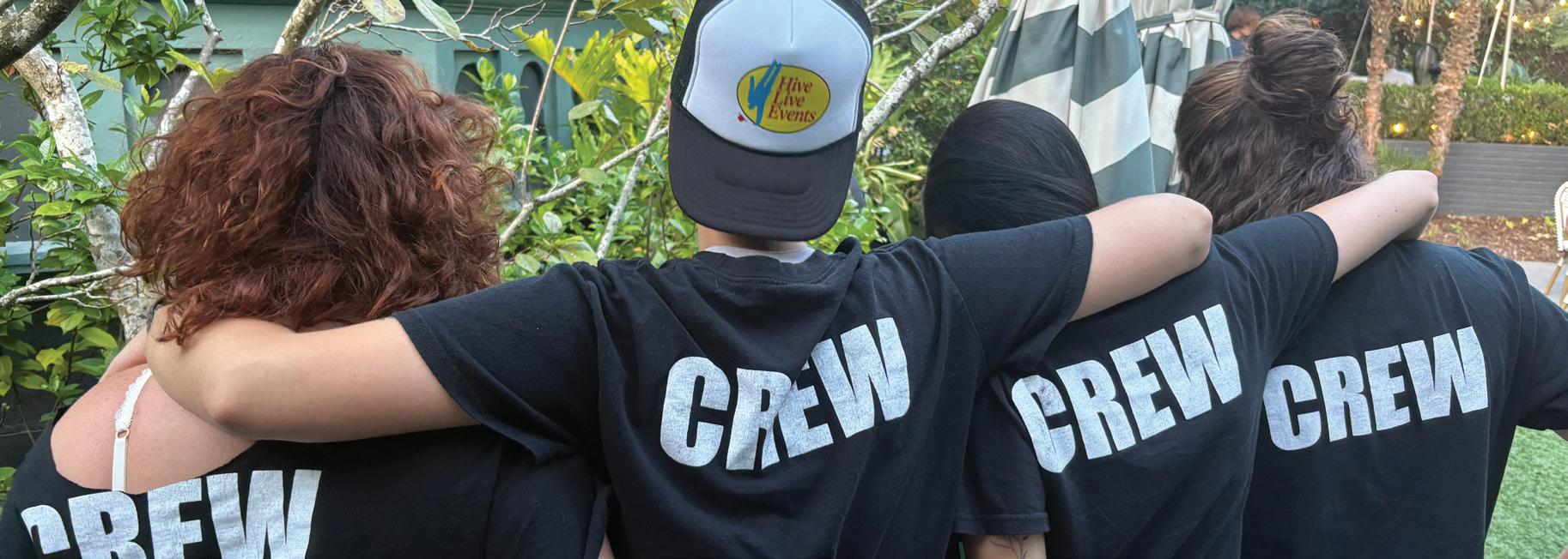 Macee Fielding, Remi Grady-Mullen, Violet Johnson, and Ana Guilbeau wearing crew shirts at a gig at the Chloe on Sept. 14, 2026. Courtesy of NOLA Sound.