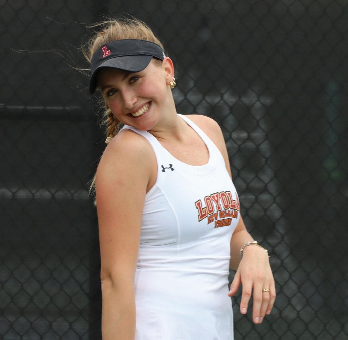 Micaela Ponce hits a shot on a City Park tennis court. Ponce plays for Loyola's tennis team. Courtesy of Wolf Pack Athletics