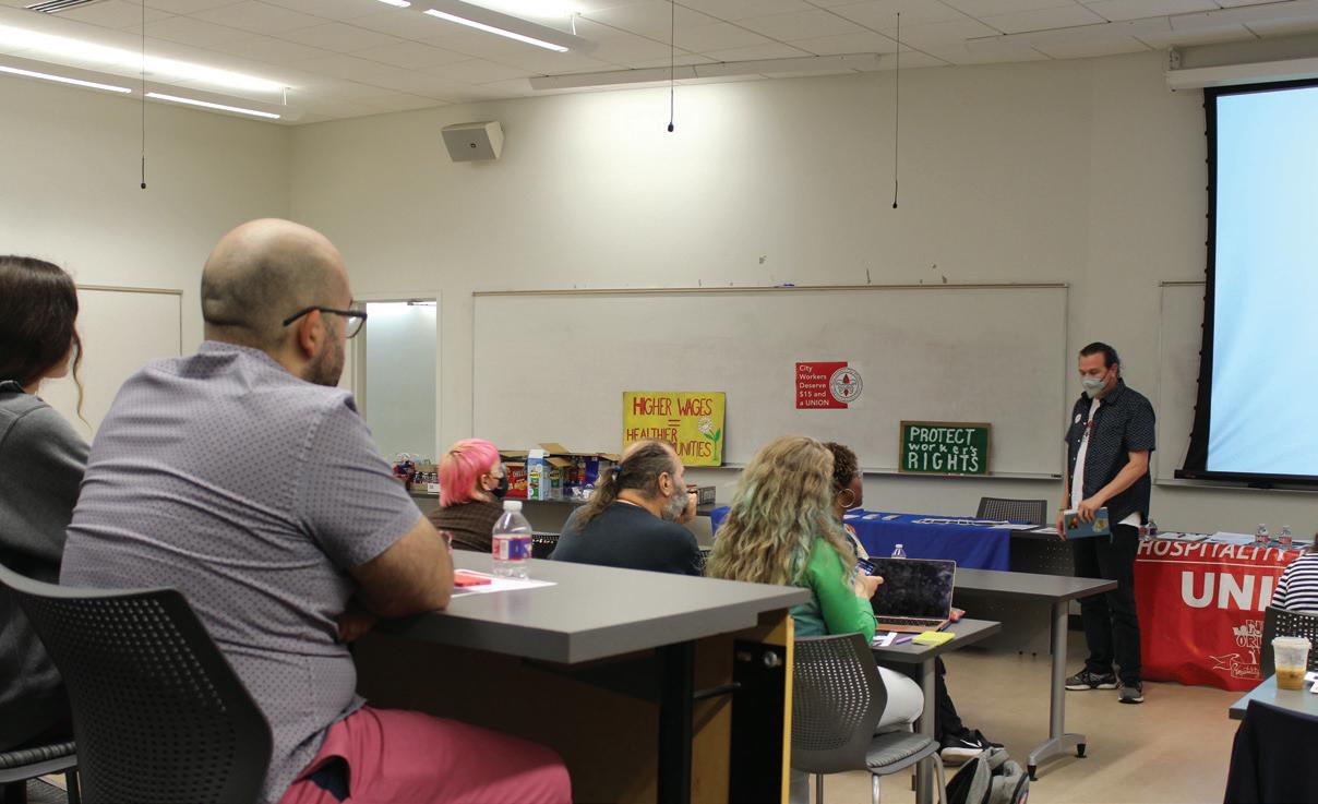 Local union leaders, workers, and Loyola faculty gathered in a Monroe Hall lecture room to discuss the ongoing history of collective labor organizing.