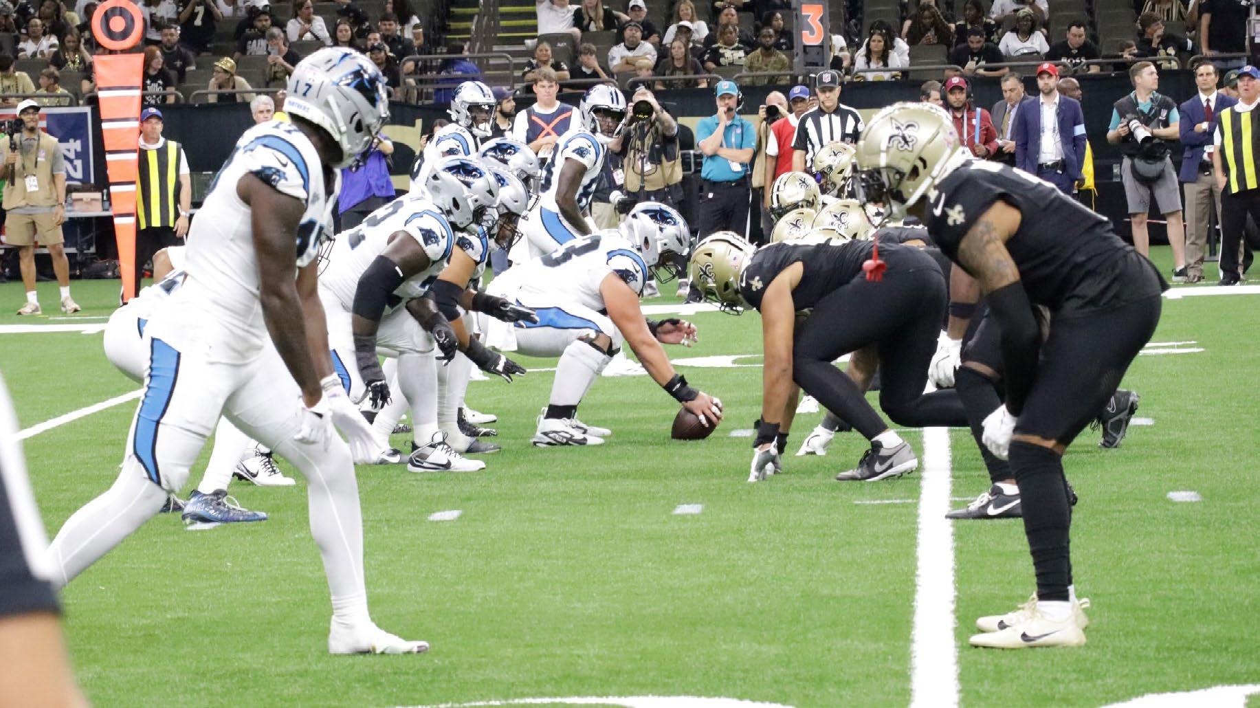 The New Orleans Saints line up for a play against the Carolina Panthers on Sep. 8, 2024 at the Caesars Superdome in New Orleans, La. Photo by Siobhan Terry.